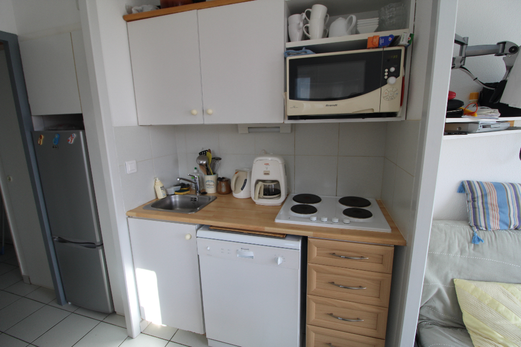 Séjour, coin cuisine équipé, salle de bains avec WC.