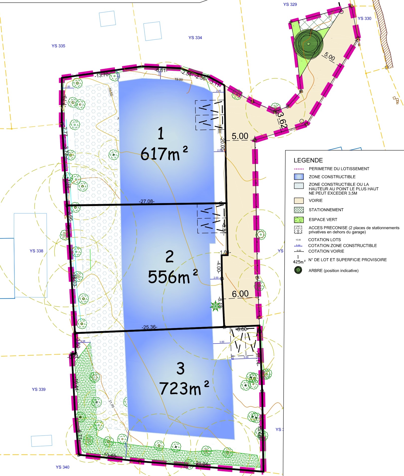 Aménagement de trois terrains à bâtir desservis par une voirie en impasse avec un stationnement comun.