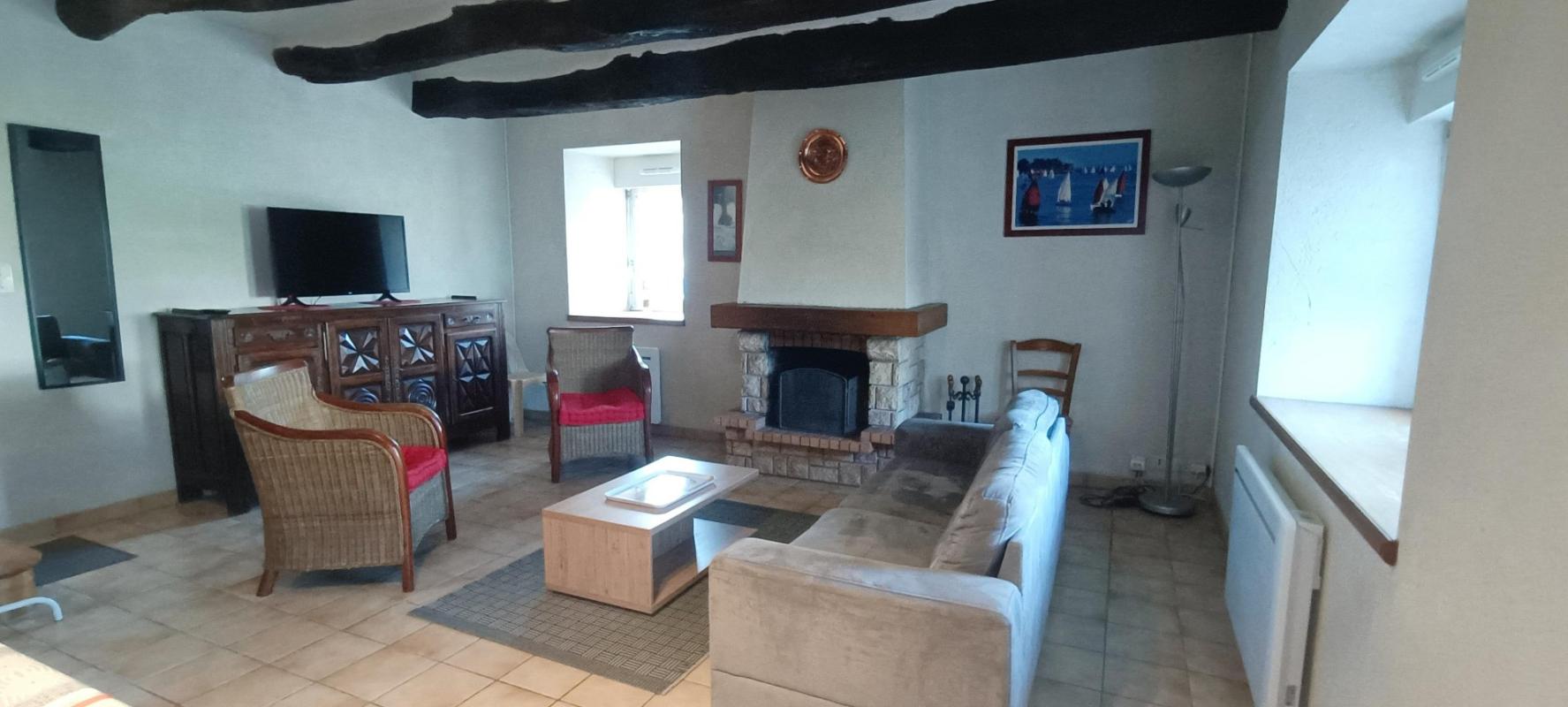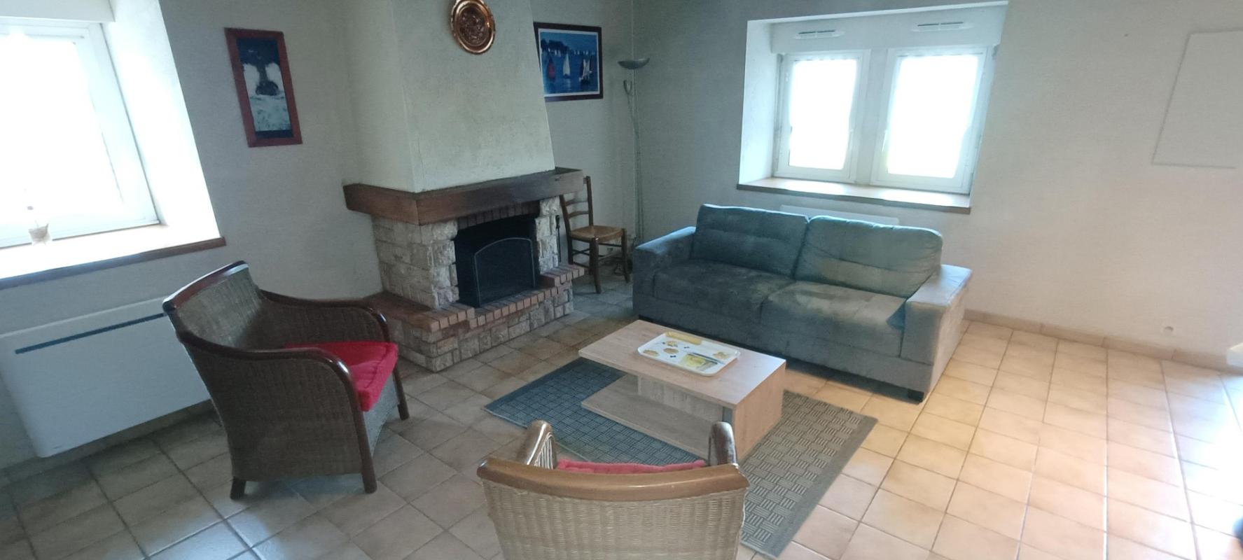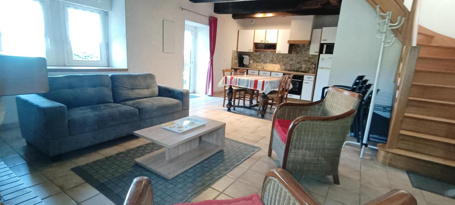 Maison meublée de T4 entrée sur salon séjour avec cheminée décorative, cuisine aménagée et équipée (hotte plaques gaz four lave vaisselle), l’ensemble donnant sur une terrasse, wc avec lave mains et machine a laver.
