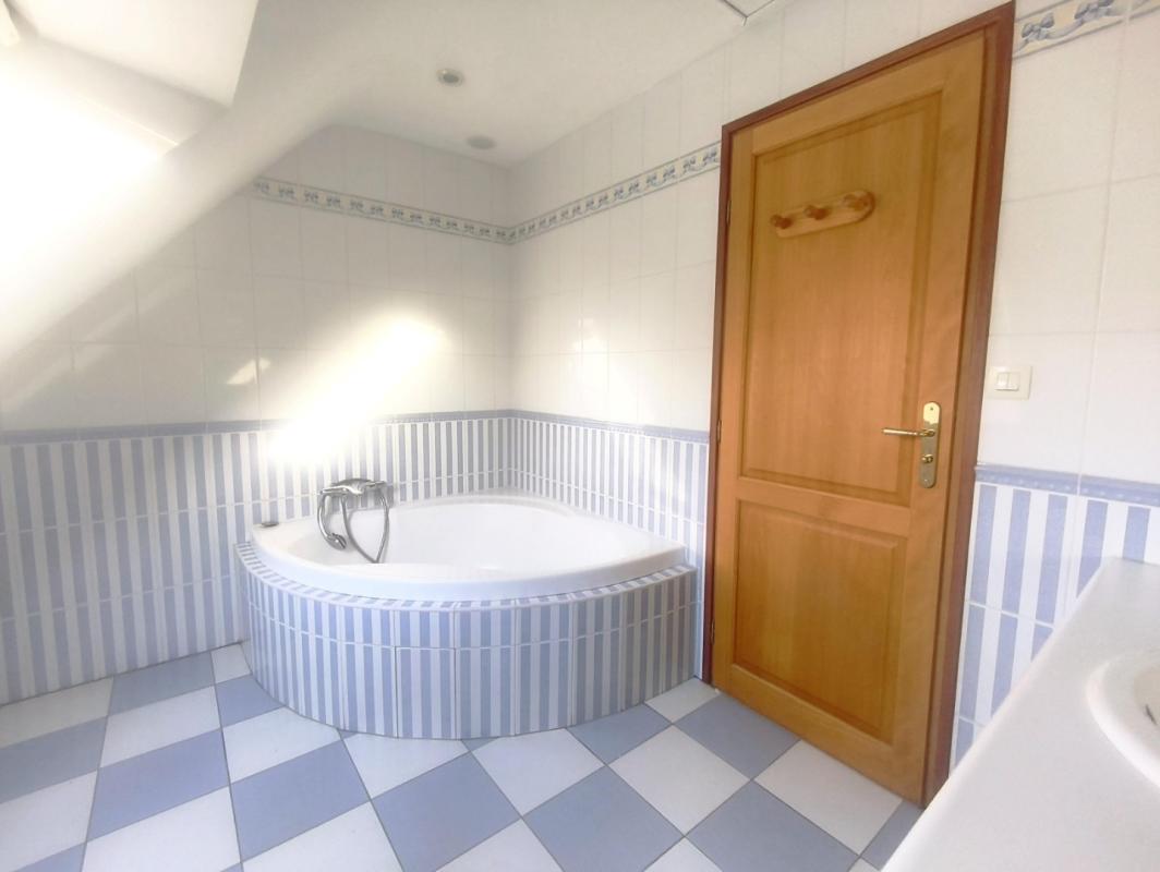 A l’étage la mezzanine dispose de placards et dessert trois chambres avec placard, une salle de bains avec double vasque, un wc, une suite parentale avec placard et salle d’eau privative.