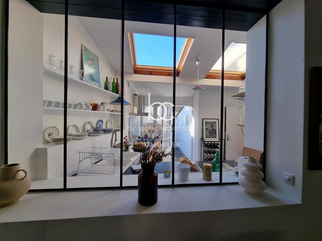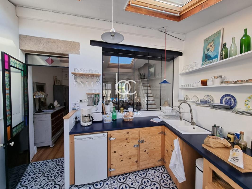 Jolie maison ancienne en pierre au coeur du bourg de l’Ile-aux-Moines. Située à 10 minutes à pied de l’embarcadère et 5min à pied de la ravissante plage de Port Miquel, cette maison aux volets rouges possède un charme fou. Très joliment rénovée, elle présente une grande pièce à vivre (salon-salle à manger) avec belle hauteur sous plafond et cheminée. Le parquet au sol apporte une atmosphère confortable et chaleureuse à la pièce. Cette dernière s’ouvre sur une cuisine séparée par une verrière de type industriel. Avec ses ouvertures traversantes et son vélux dans la cuisine, la maison est baignée de lumière.
