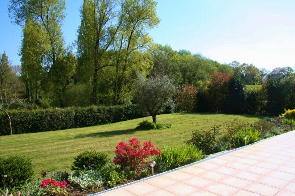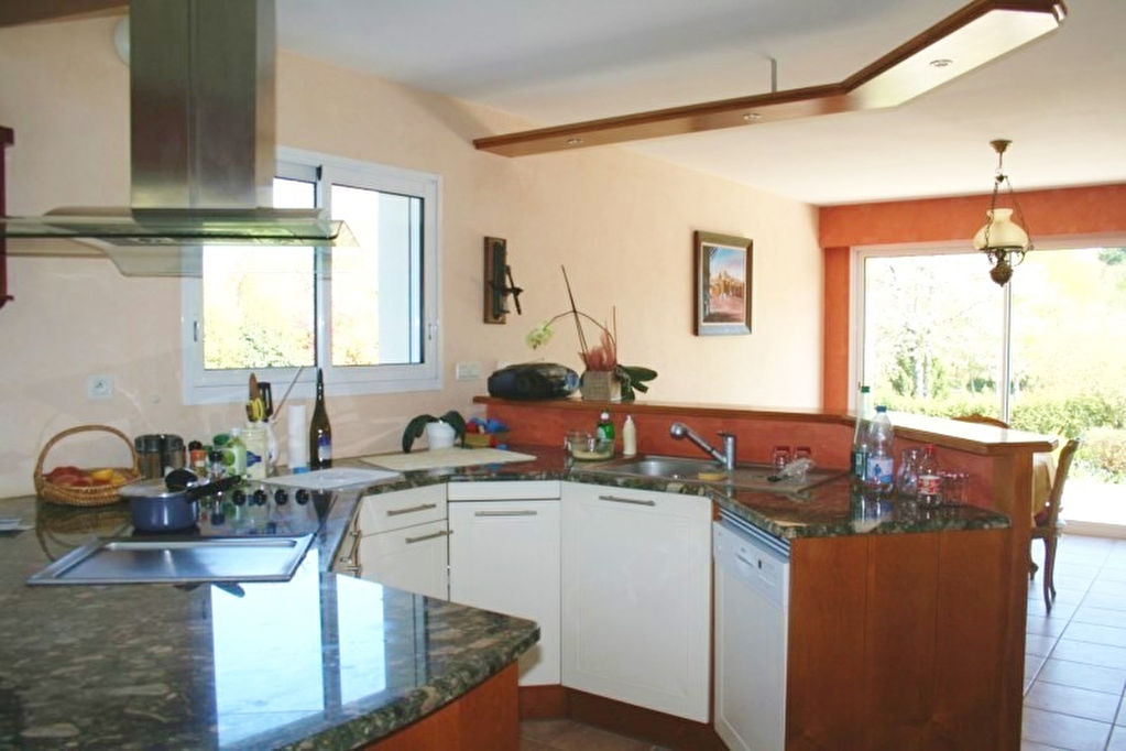 Au rez-de-chaussée : Hall, séjour-salon, cuisine équipée avec salle à manger, une suite avec dressing et salle d’eau, wc, buanderie. Garage double avec 2 pièces (100 m²).