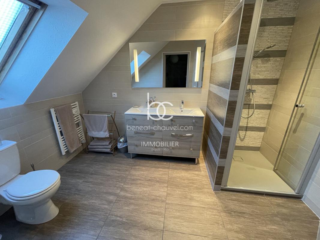 A l’étage : deux chambres avec salle d’eau partagée, mezzanine avec wc, deux chambres dont une donnant sur salle d’eau avec wc.