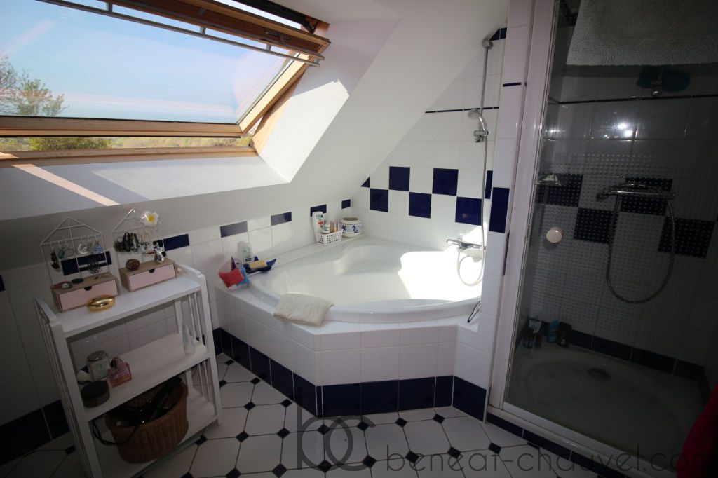 A l’étage se trouvent un dégagement, quatre chambres, une salle de bain avec douche et wc séparé.