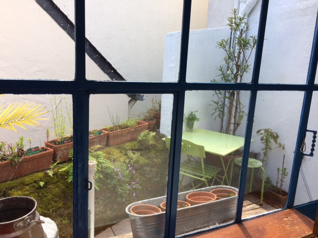 RDC : pièce à vivre avec cheminée, cuisine ouverte dans une véranda ancienne donnant sur une petite courette