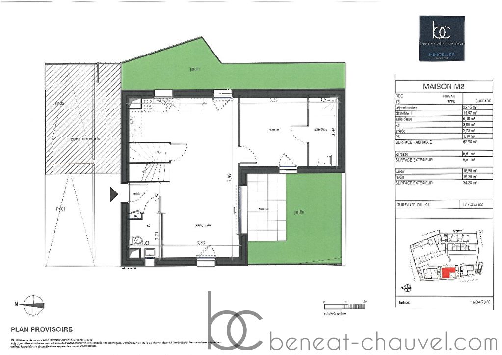 Sarzeau centre, dans un ensemble immobilier de Standing, une maison de type 5 pièces de 95 m² environ offrant au rez-de-chaussée: un beau séjour cuisine, une chambre avec salle d’eau, un wc, A l’étage: trois chambres et une salle de bain, toilette. jardin de 34 m² et terrasse. Frais de notaires réduit. Livraison prévue au 4ème trimestre 2022. Parking couvert et parking aérien.