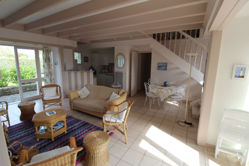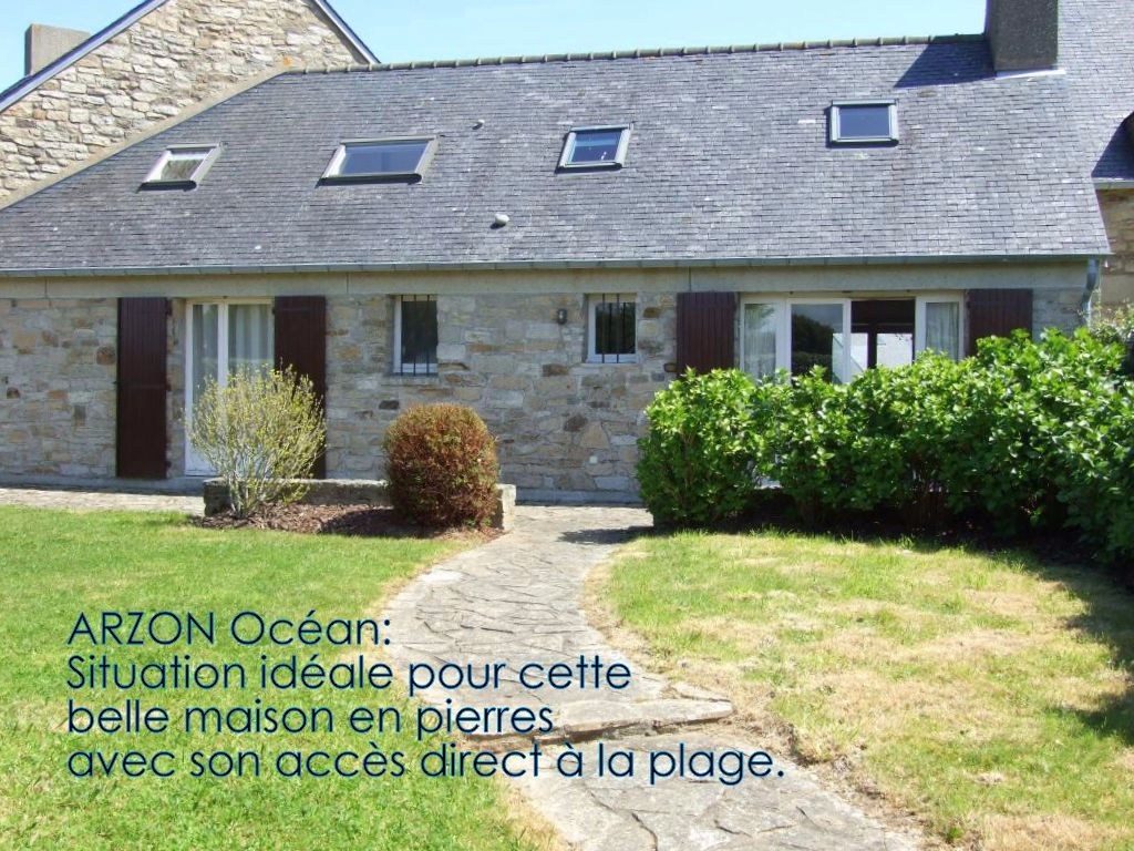 Situation idéale, accès direct plage, belle maison en pierres et comprenant : grande pièce à vivre avec cheminée, cuisine équipée, suite parentale en rez de chaussée, salle de bains. A l’étage : 2 chambres, chambre cabine, salle de bains, mezzanine et rangements. Surface au sol de 108 m². Jardin clos. A voir absolument.