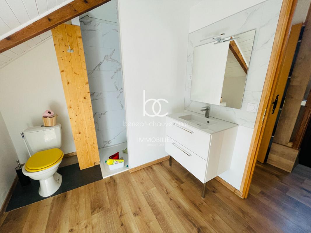 L’agencement intérieur est à la fois fonctionnel et chaleureux. Le rez-de-chaussée s’ouvre sur une entrée accueillante qui dessert un cellier pratique, une cuisine entièrement aménagée et équipée ouverte sur une salle à manger conviviale et réchauffée par un poêle à pellets. Il dispose également d’un salon séjour séparé et d’une suite de plain-pied comprenant une chambre avec placard et une salle d’eau, un agencement très recherché. A l’étage, l’espace nuit est bien distribué autour d’un palier, offrant deux chambres supplémentaires, un placard et une salle d’eau complète avec WC.