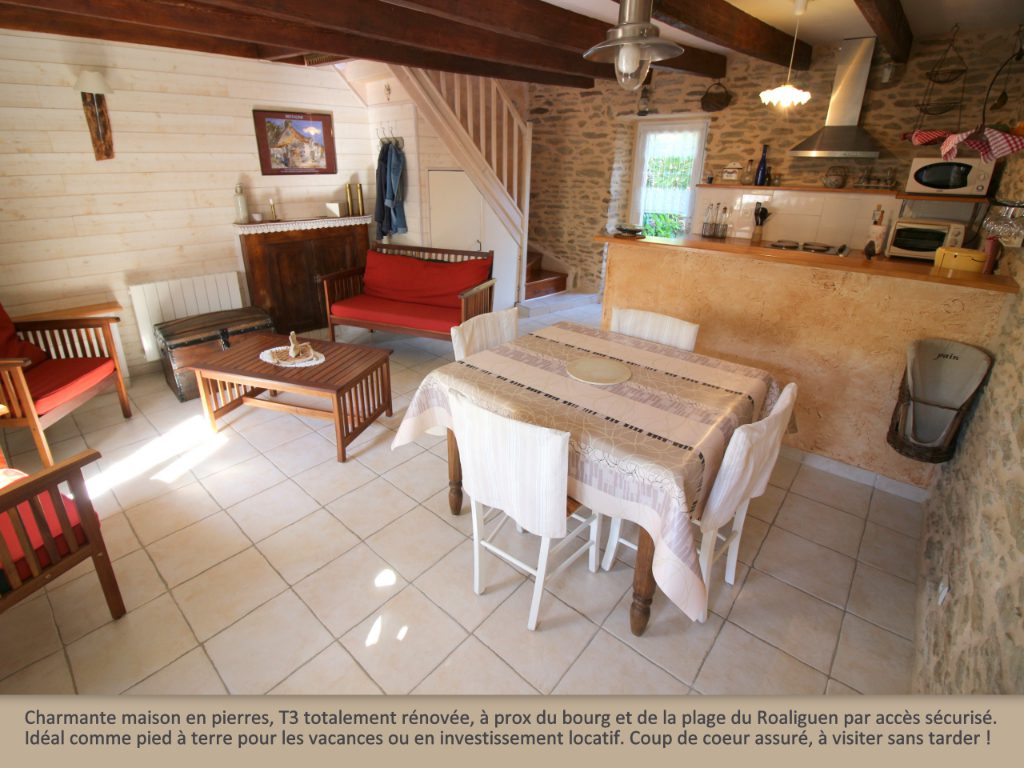 Charmante maison en pierres totalement rénovée, à proximité du bourg et de la plage du Roaliguen par accès sécurisé. Agréable pièce de vie avec sa cuisine donnant sur une terrasse plein Sud, jardinet, à l’étage 2 chambres, une salle d’eau et un wc séparé. Idéal comme pied à terre pour les vacances ou en investissement locatif.