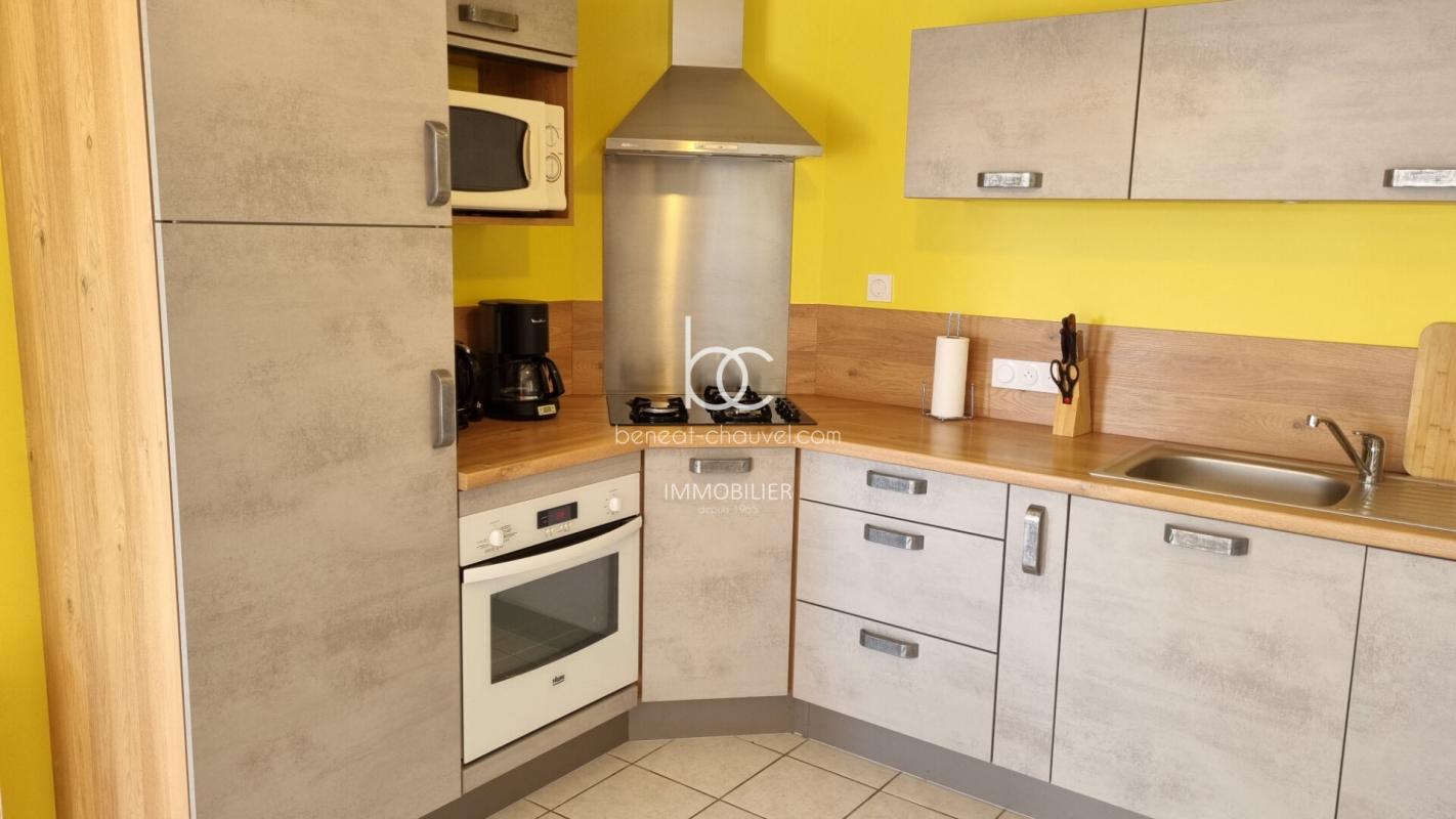 Entrée – Cuisine américaine équipée et aménagée (hotte ; four ; réfrigérateur/congélateur ; plaque de cuisson mixte (gaz et électrique) ; lave-vaisselle) (éléments de rangements) – Séjour/Salon (poêle à bois) – Salle d’eau – W.C.