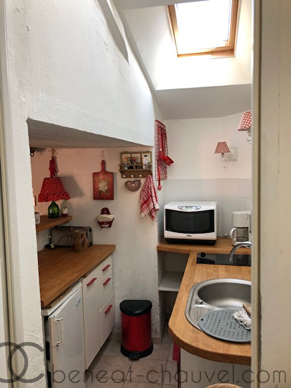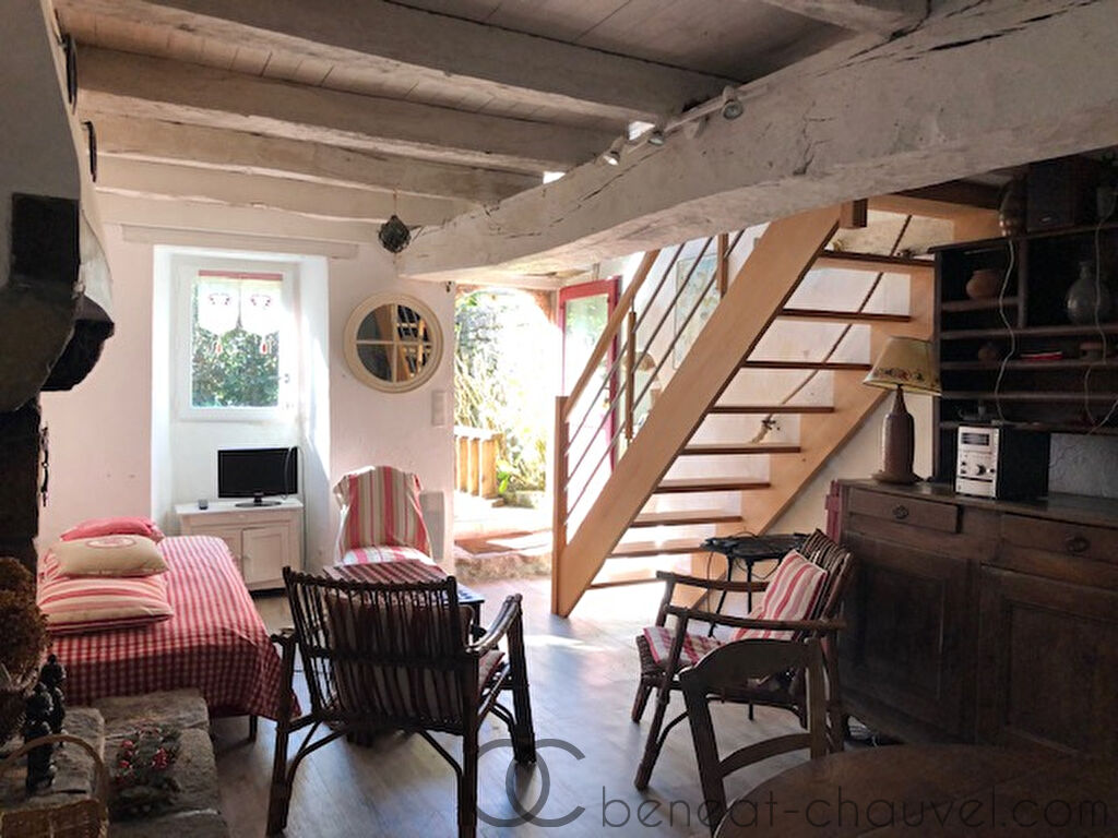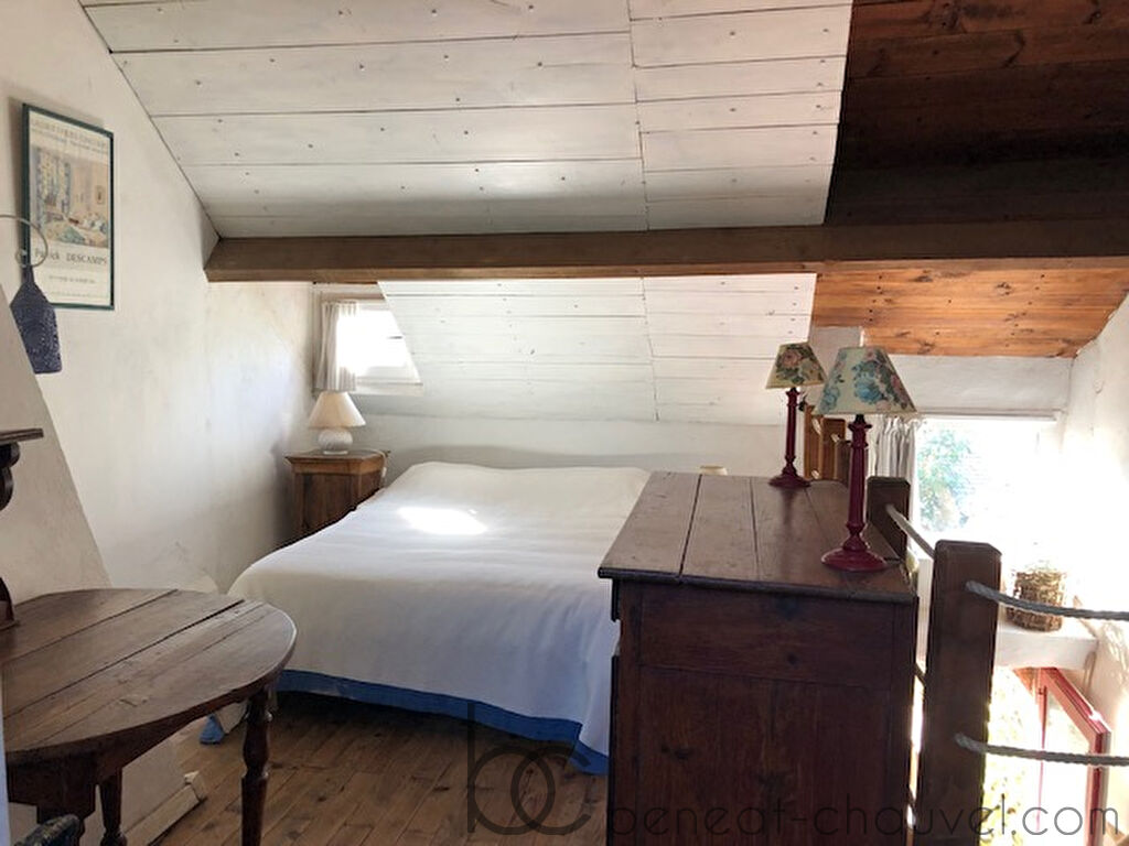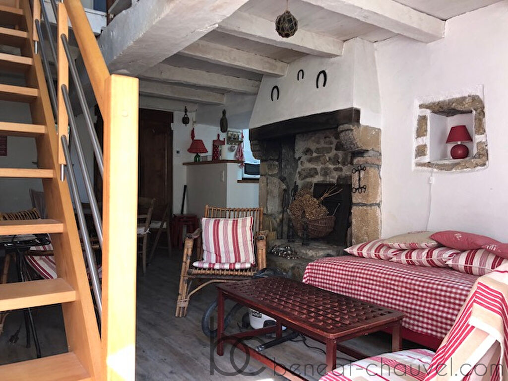 Au RDC : pièce de séjour avec une belle cheminée, cuisine aménagée et équipée, salle d’eau wc, à l’étage une chambre en mezzanine communiquant avec une petite chambre.