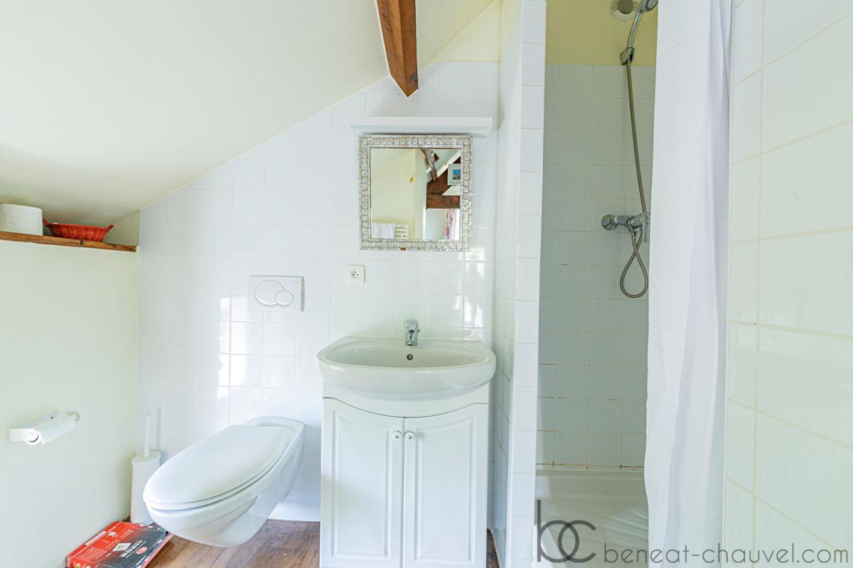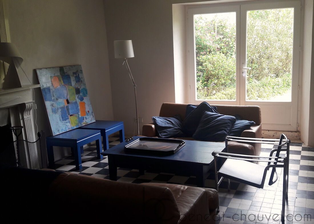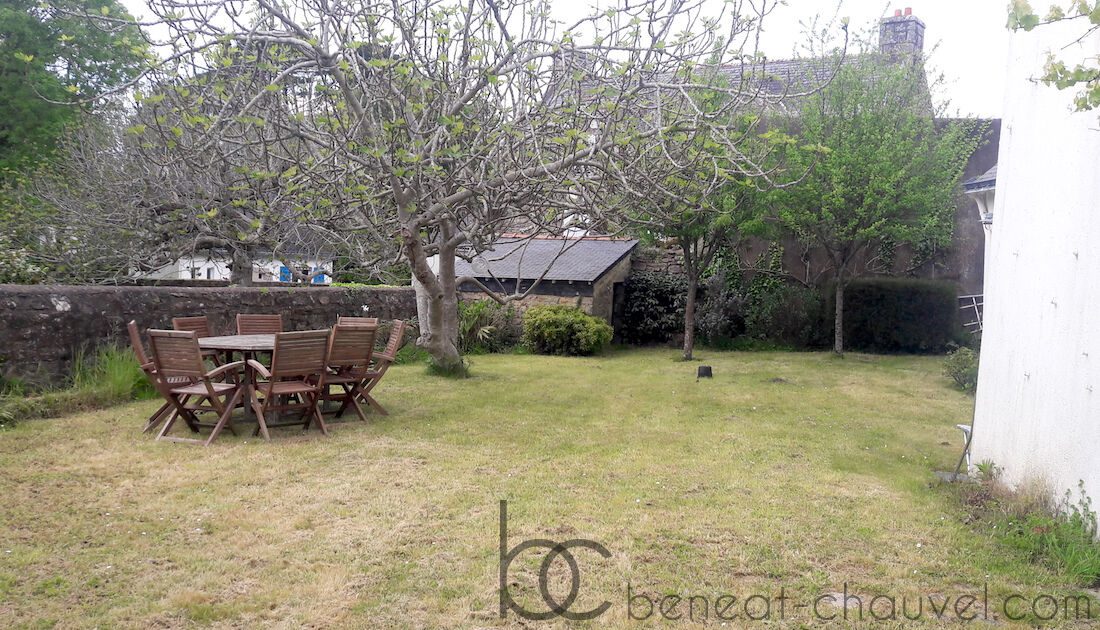 Cuisine / salle à manger, pièce de séjour avec cheminée ouvrant sur le jardin exposé au sud-ouest, une chambre, 3 chambres à l’étage, une salle d’eau, une salle de bains .
