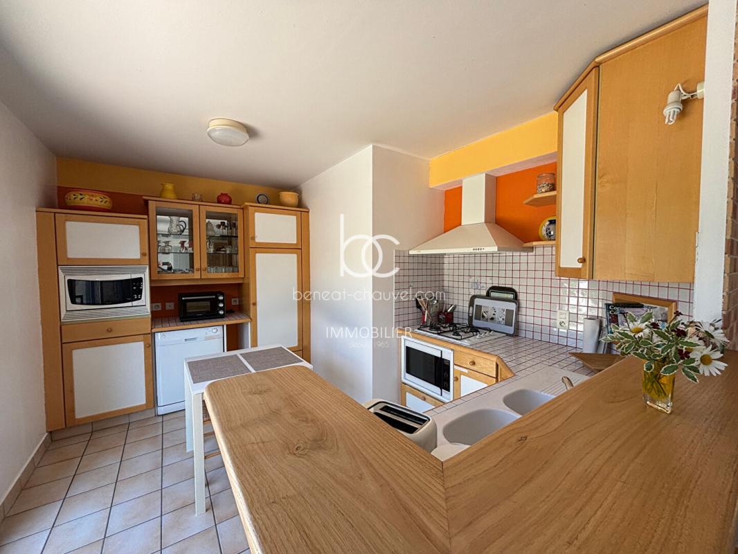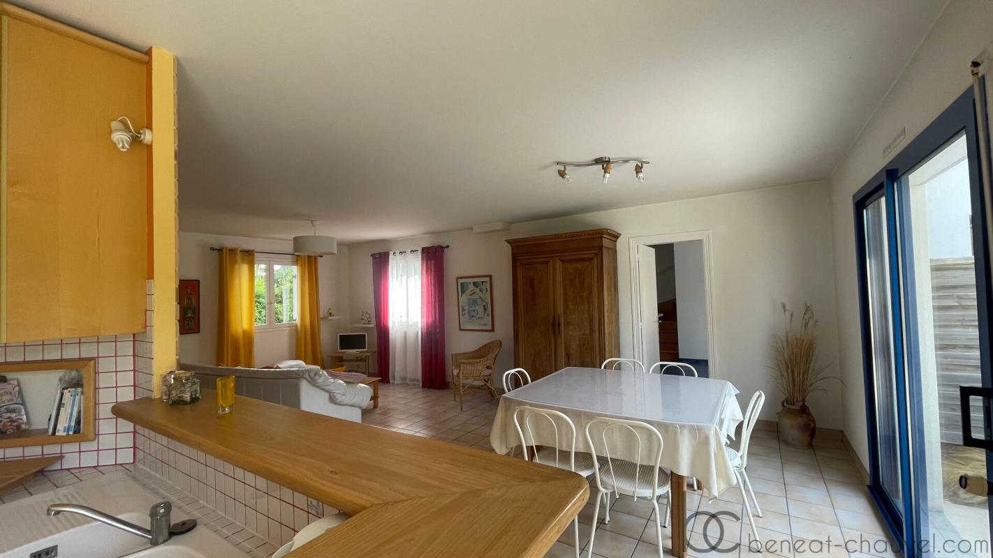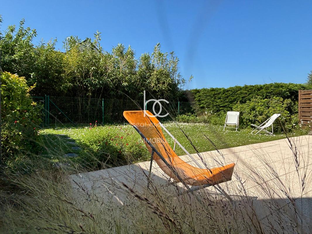 Au rez-de-chaussée : séjour-salon et cuisine ouverte aménagée orientés Est et Sud, donnent directement à une grande terrasse et un joli jardin clos.