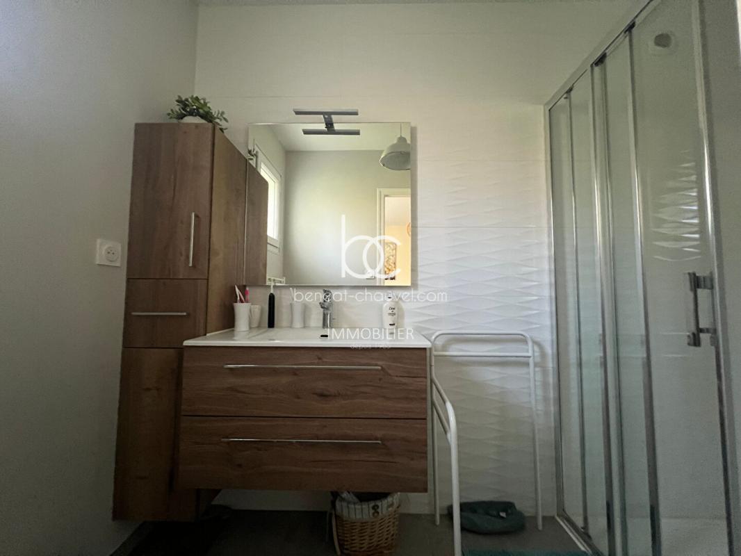 La maison dispose d’un bel espace de vie et d’une cuisine indépendante, aménagée et équipée. Le rez-de-chaussée est complété par un cellier, une chambre avec dressing et une salle d’eau.