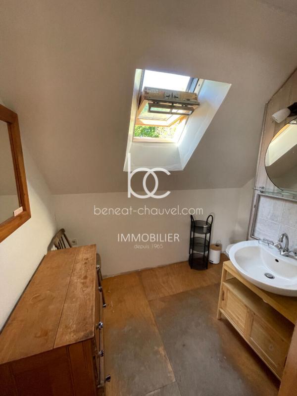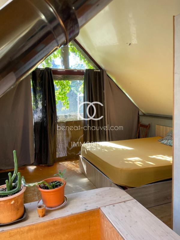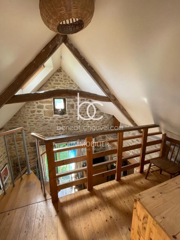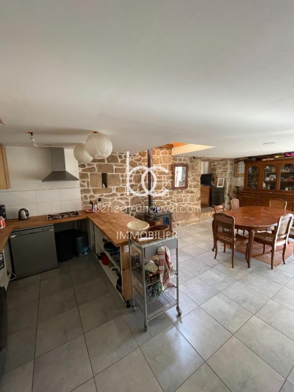 Pièce de vie : Vous découvrirez une chaleureuse salle à manger avec pierres apparentes et son poêle à bois. La cuisine est ouverte, aménagée et équipée.
