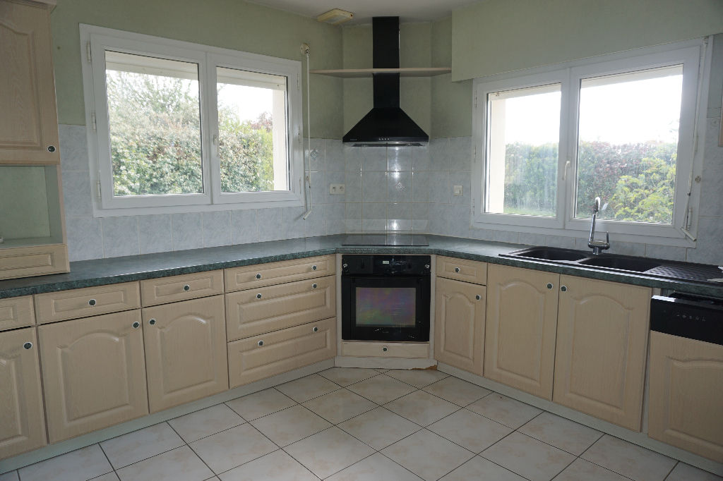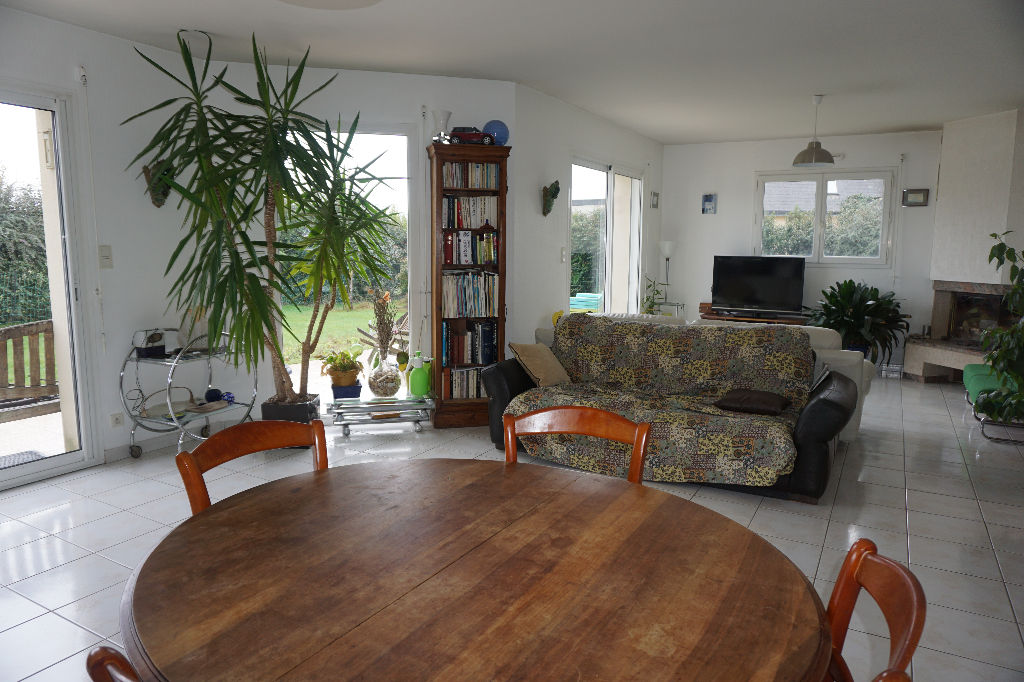 Hall, séjour-salon avec cheminée, cuisine équipée, une chambre, salle de bains, wc, buanderie, garage.
