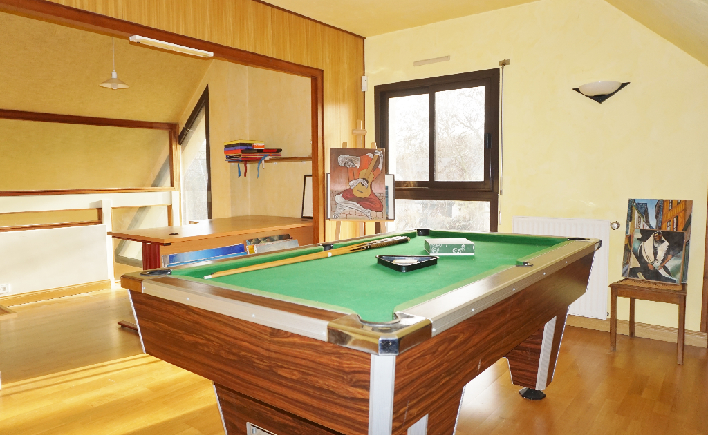 Deux garages dont un avec grenier au-dessus. Etage : 4 chambres, salle de bains, salle d’eau, wc, greniers.