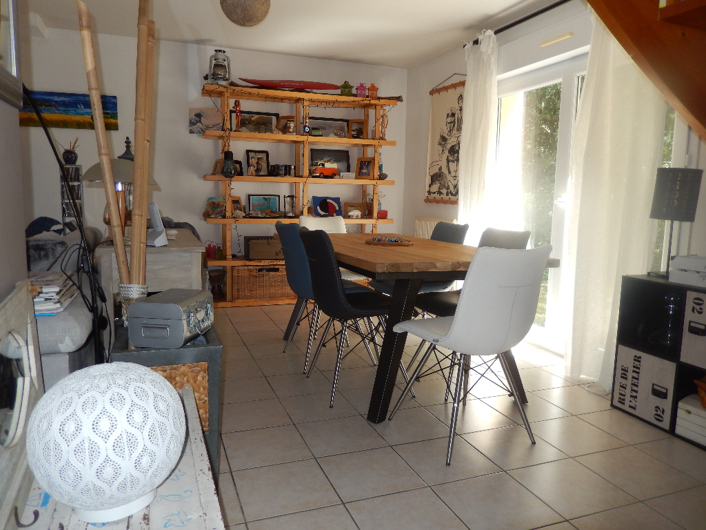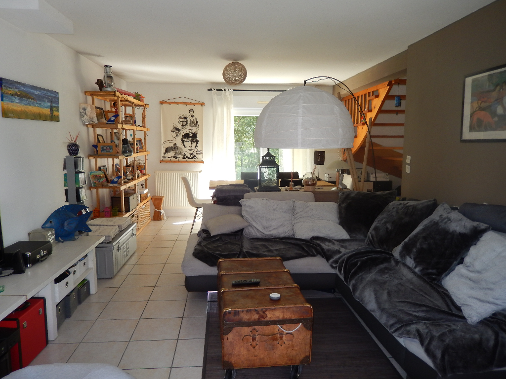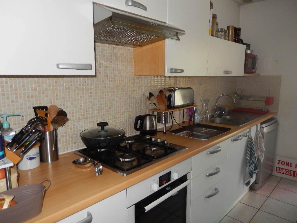 Entrée avec placard, séjour-salon, cuisine aménagée et équipée, wc
