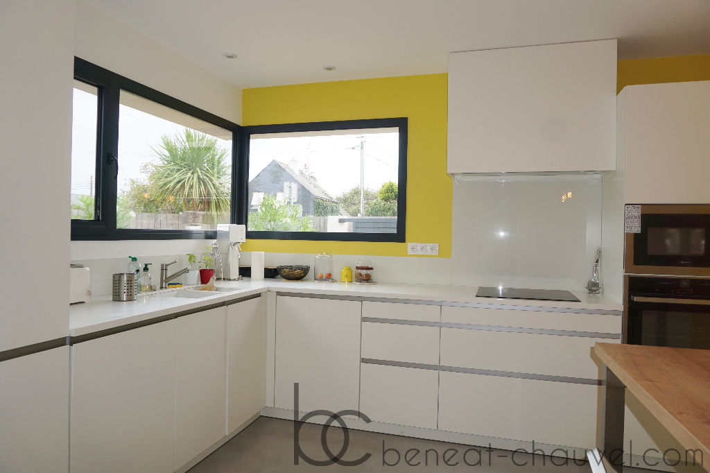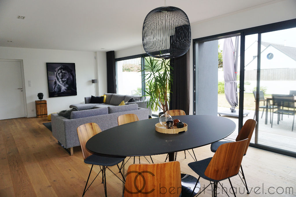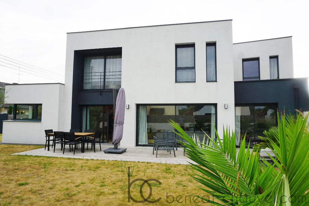 Vannes Sud, beaucoup de raffinement et très belles prestations pour cette Superbe maison d’architecte située sur un terrain de 480 m² comprenant : Hall, séjour salon cheminée, cuisine équipée, buanderie, wc, une chambre avec dressing, wc et sa salle d’eau ouvrant sur un patio intime, Grand garage. Etage : Mezzanine, 3 chambres, bureau, salle d’eau, wc.