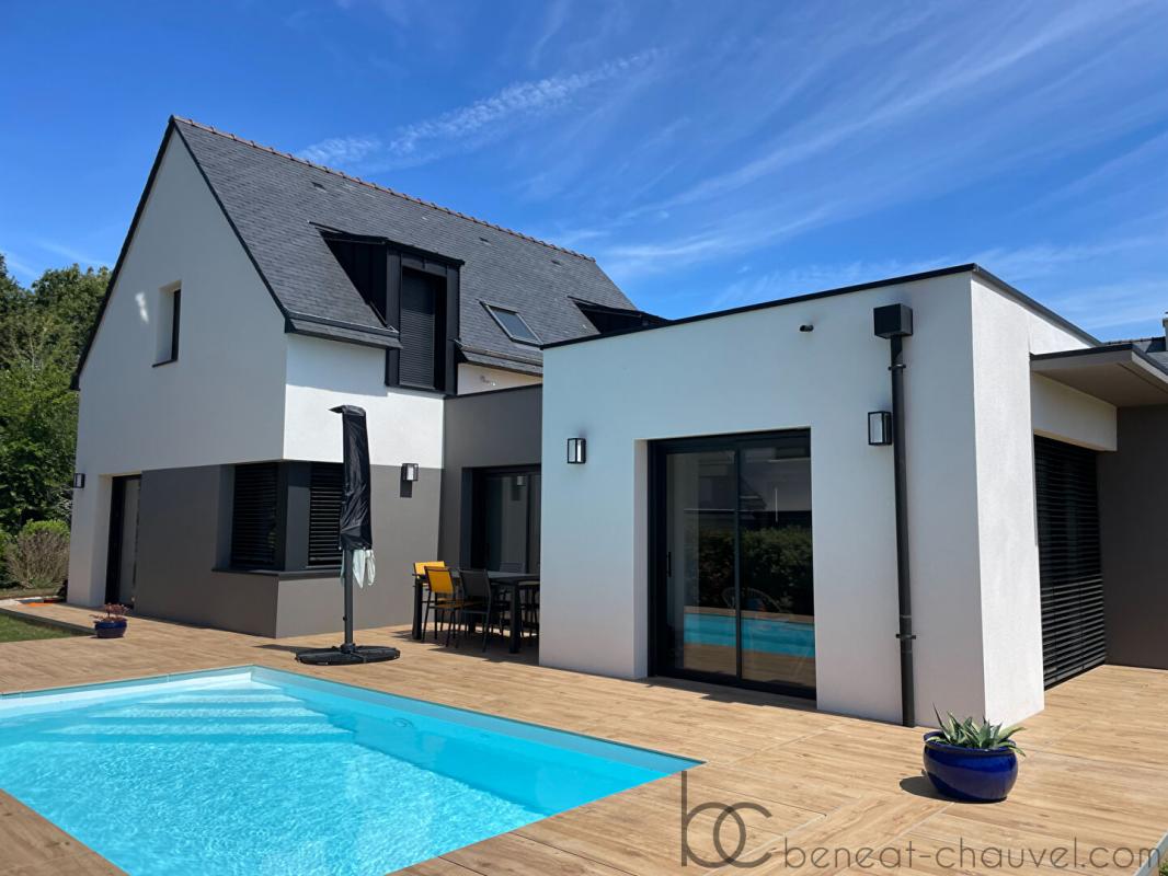 Venez découvrir cette magnifique maison d’architecte avec piscine comprenant beau salon séjour avec cuisine ouverte aménagée et équipée, suite parentale avec salle d’eau et WC, bureau ou chambre, cellier et wc. A l’étage, deux chambres, salle de bains avec douche et wc indépendant. Vaste garage avec coin atelier.