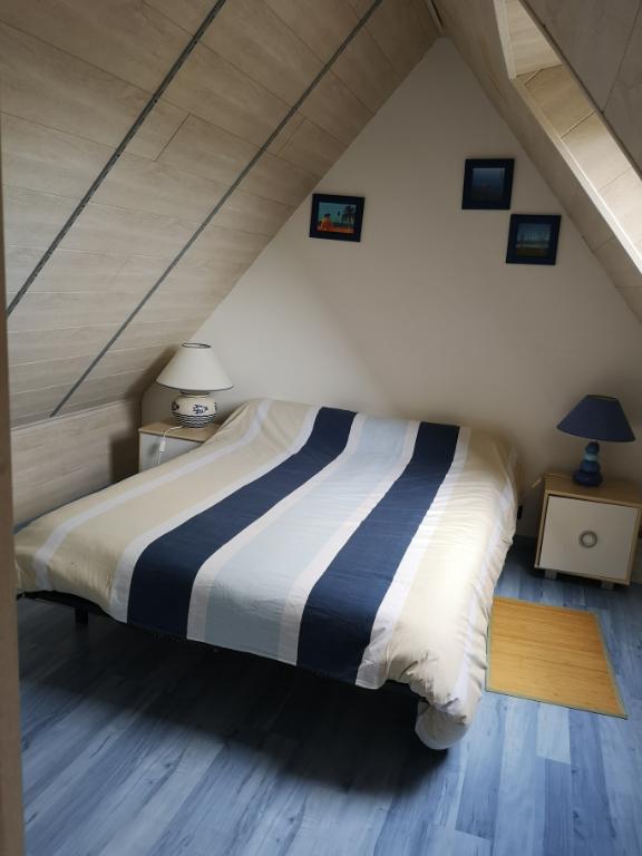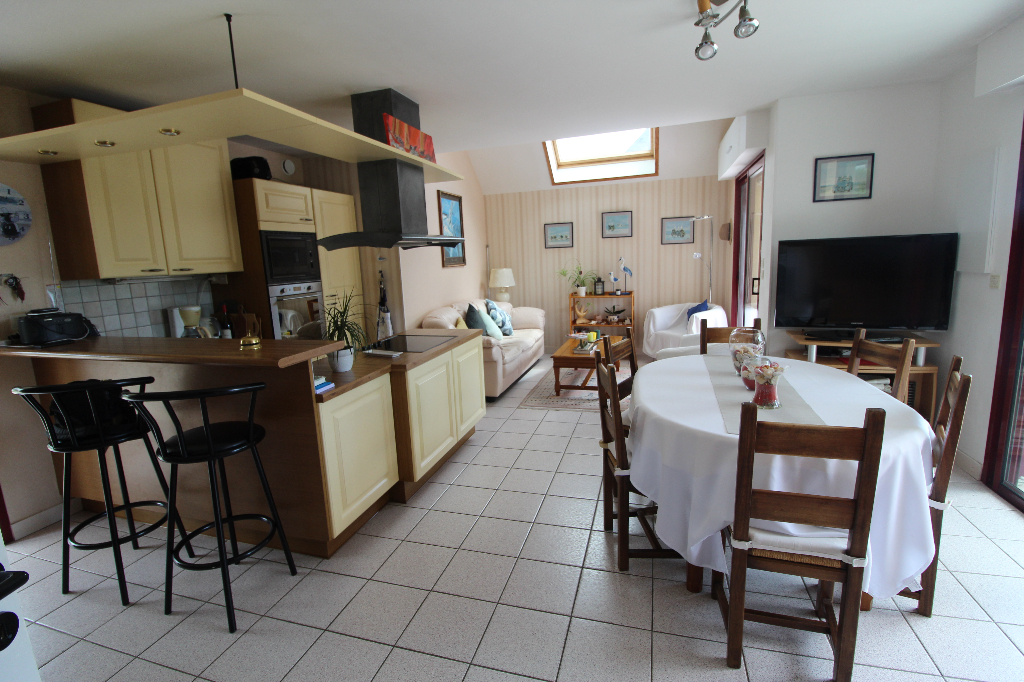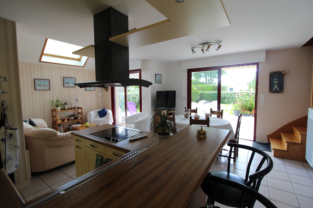ARZON à proximité immédiate des commerces , de la plage et du Port du Crouesty une maison lumineuse comprenant au rdc entrée, séjour salon exposé sud ouest, cuisine ouverte aménagée et équipée, chambre, salle d’eau et WC. A l’étage mezzanine, 2 chambres et WC.