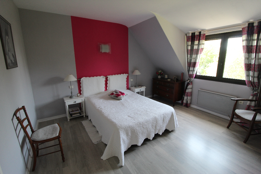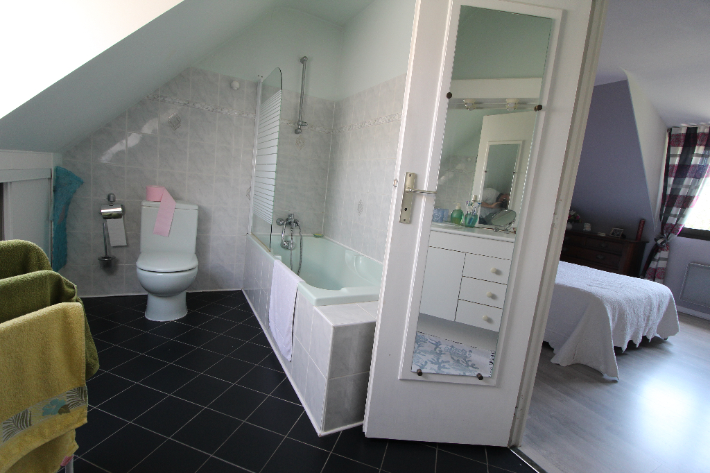 A l’étage chambre avec salle de bains et WC, 2 chambres, salle d’eau avec WC.