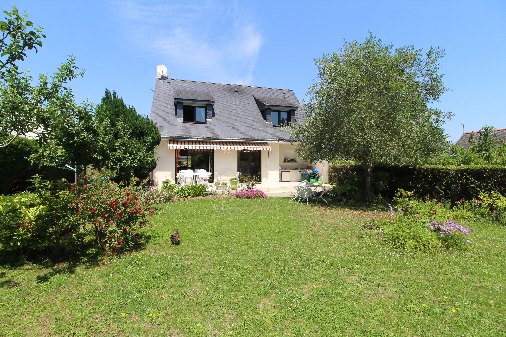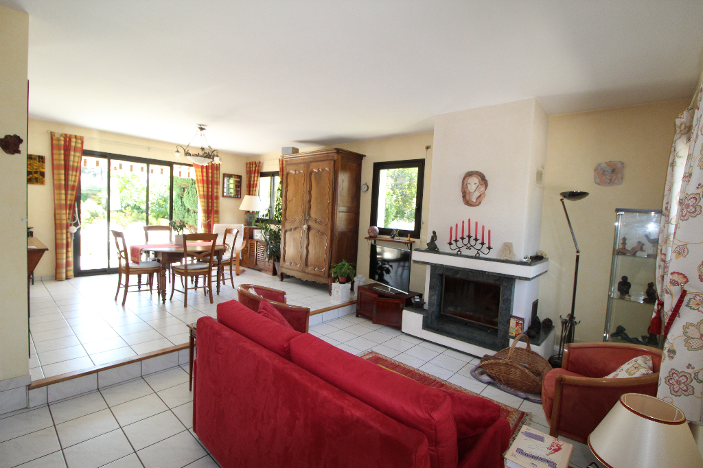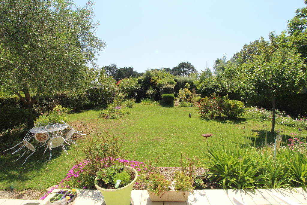 Jardin clos et arboré et terrasse avec cuisine d’été exposée plein sud