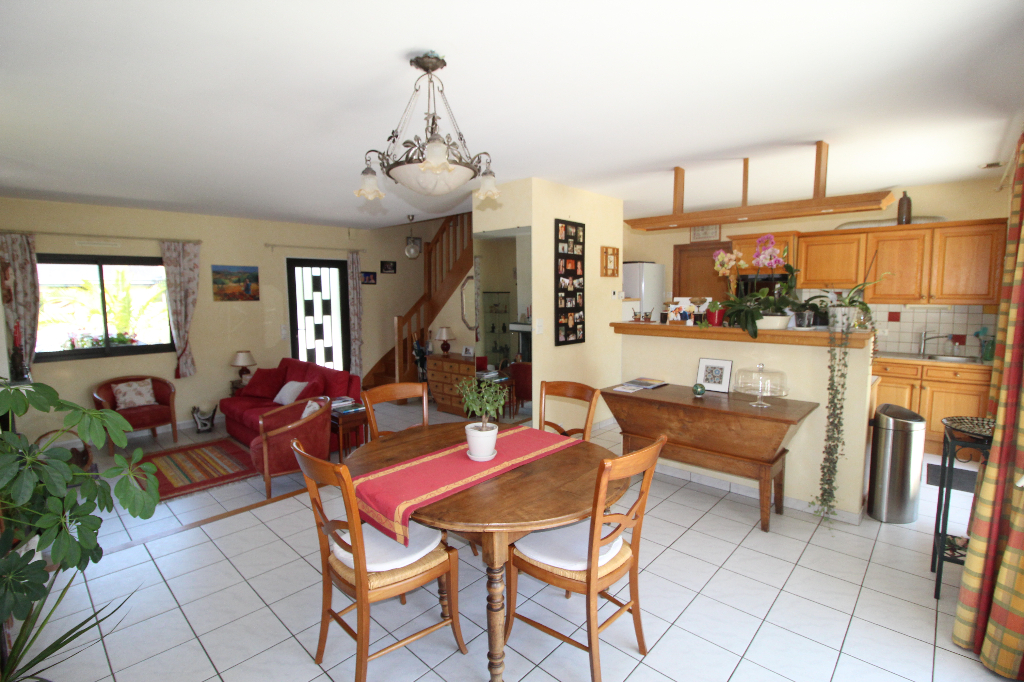 EXCLUSIVITÉ. A proximité de la plage de Port Navalo, une maison comprenant au rdc séjour salon avec cheminée, cuisine ouverte aménagée et équipée, cellier avec accès cave en sous sol, chambre, WC indépendant,