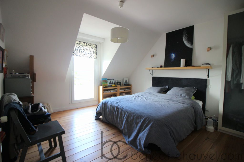 A l’étage: le pallier/couloir dessert 4 chambres dont une avec terrasse et vue sur le jardin, wc et salle de bain.