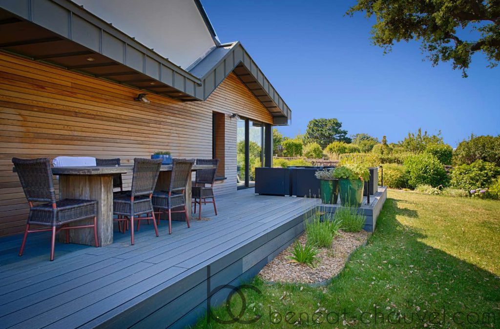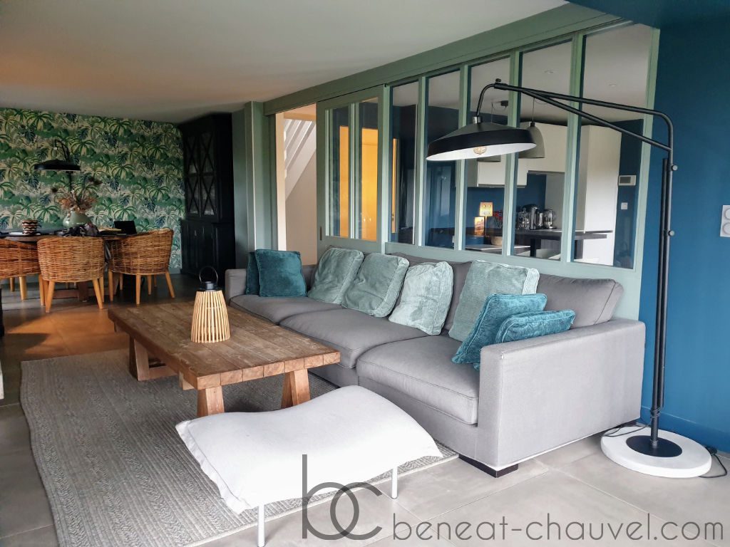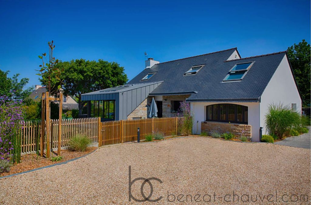 Au coeur d’un petit hameau de la presqu’île de Rhuys, au pied des sentiers côtiers du Golfe du Morbihan. Profitant d’une petite vue sur le Golfe, agréable maison entièrement rénovée avec goût en 2019 offrant environ 137.30m2 habitables (180m2 au sol). De plain pied : grande entrée, séjour de 46m2 avec cheminée en pierre, cuisine verrière aménagée/équipée. Les pièces de vie exposées sud-ouest donnent accès à une grande terrasse en bois et au jardin sans vis à vis. Deux chambres au rez-de-chaussée avec chacune une salle d’eau et wc privatifs, wc, buanderie. Étage : une chambre parentale dressing, et deux autres chambres, salle de bains, wc. L’ensemble sur un terrain clos d’environ 954m2, jardin paysager, cabanon, bûcher, portail automatique.