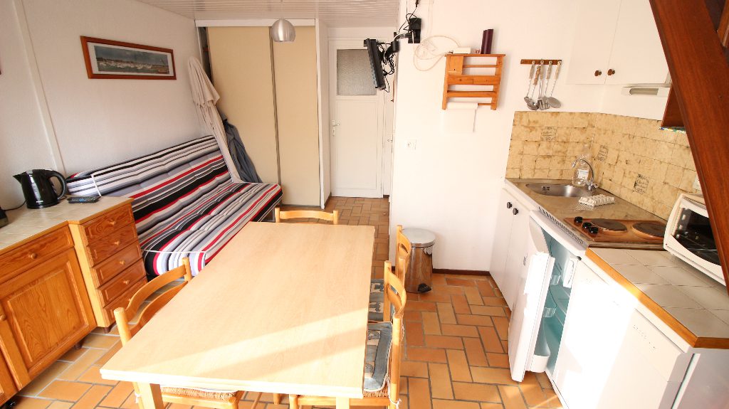 -Au Rdc : entrée avec grand placard, pièce de vie avec kitchenette donnant sur une terrasse bois orientée Sud/Ouest , salle de bain avec wc.