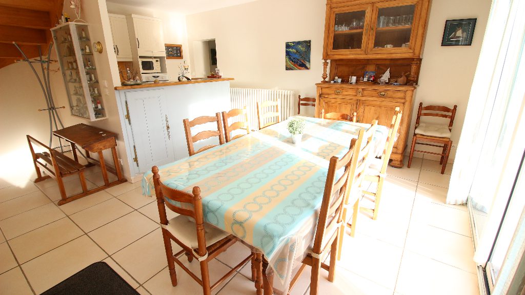 La plage à pied pour cette agréable maison au calme comprenant au rez-de-chaussée, un salon-séjour avec une cuisine ouverte donnant sur une grande terrasse, exposée plein Sud avec stores bannes, une chambre, un wc, une salle de bains, un cellier et une buanderie. A l’étage, trois belles chambres, une salle d’eau avec wc, le tout sur un terrain clos de 627 m² environ, avec son cabanon de jardin et douche de retour de plage. spacieuse, lumineuse, au calme, plage et club nautique à pied, commerces de proximité.