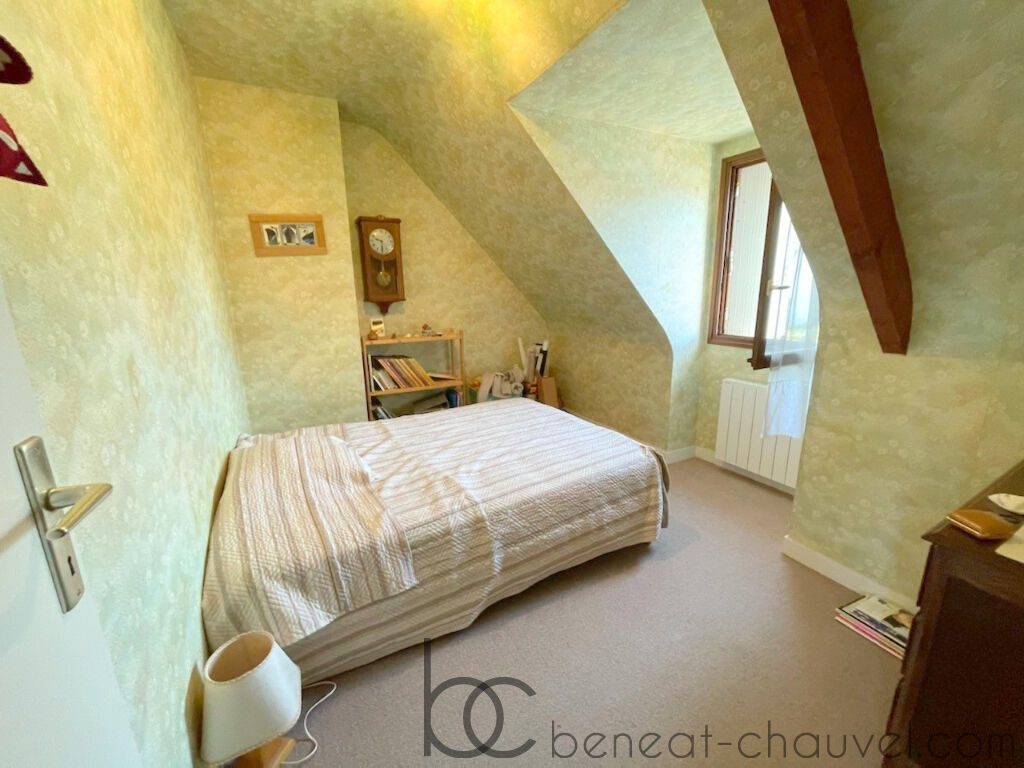 A l’étage : palier, trois chambres, salle d’eau-W.C. Garage. Jardin clos et arboré de 440 m².