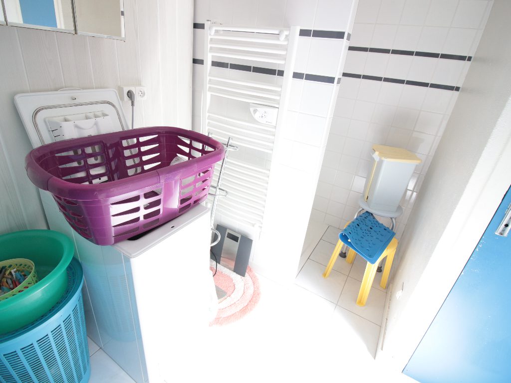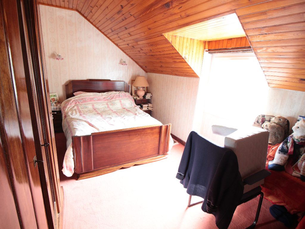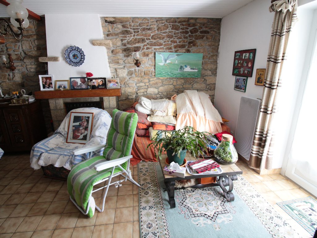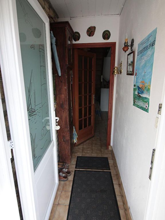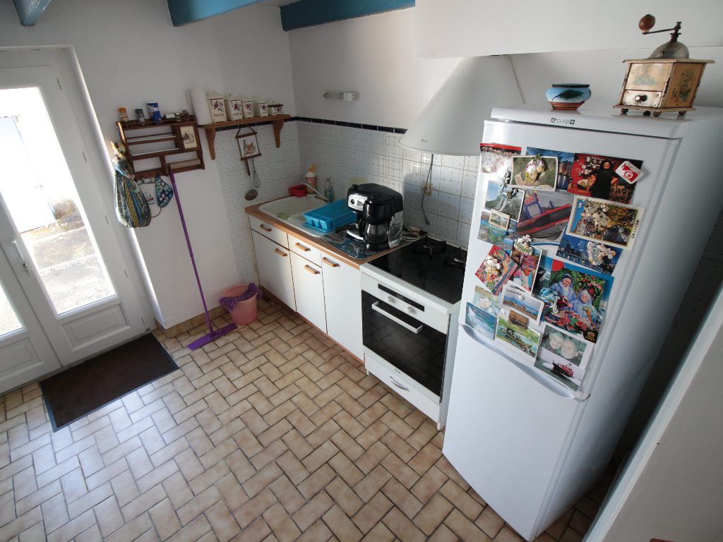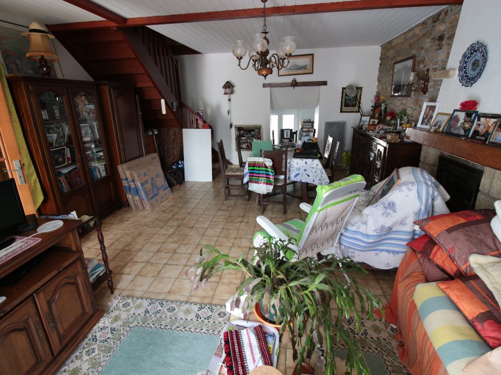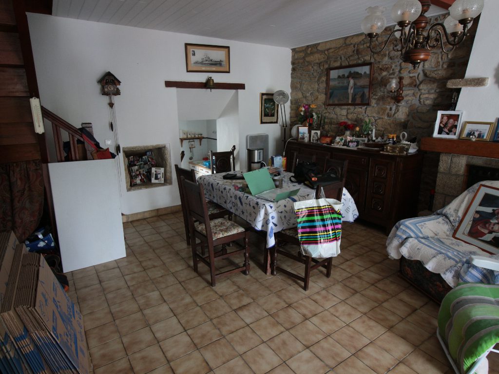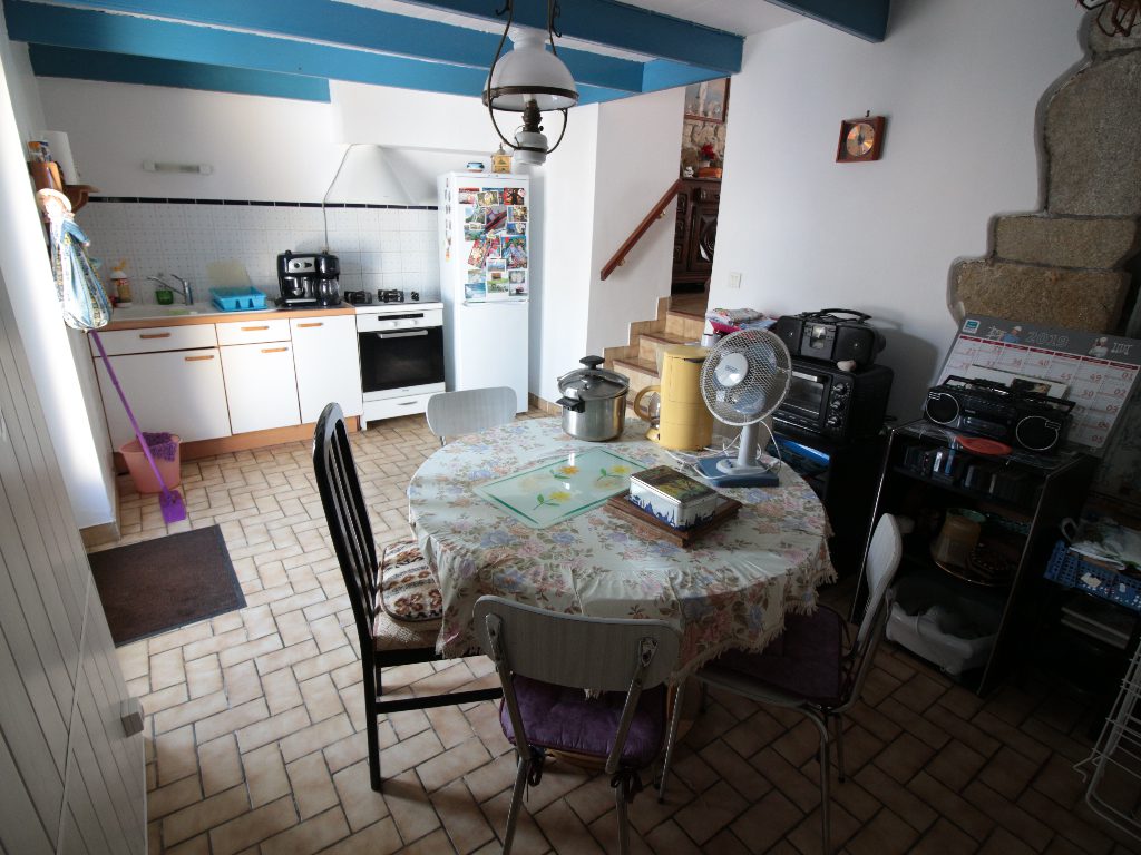 Agréable Maison de pêcheur en pierre mitoyenne des deux côtés comprenant une entrée, séjour avec insert donnant sur une terrasse orientée Sud, cuisine donnant sur une courette côté Nord, cellier, salle d’eau avec wc et buanderie, à l’étage, deux chambres, un placard, abri de jardin au niveau de la courette.
