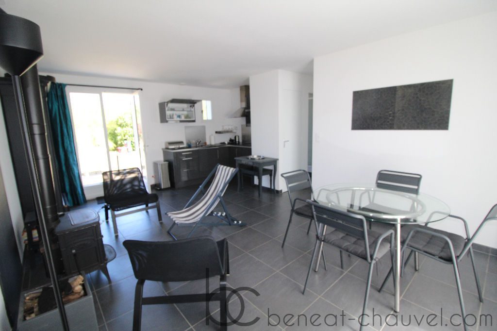 Un véritable bijou ! Etat impeccable pour cette maison rénovée il y a 8 ans avec beaucoup de goût. Très bien agencée et équipée elle fera votre bonheur ! Son plain pied de 75 m² au sol permet une vie agréable. Elle comprend : entrée, séjour-salon avec poële – cuisine aménagée et équipée donnant sur une terrasse plein sud ouest, trois chambres, salle d’eau, W.C. Buanderie avec une mezzanine. Jardin clos et arboré de 450 m². Plage à pied.