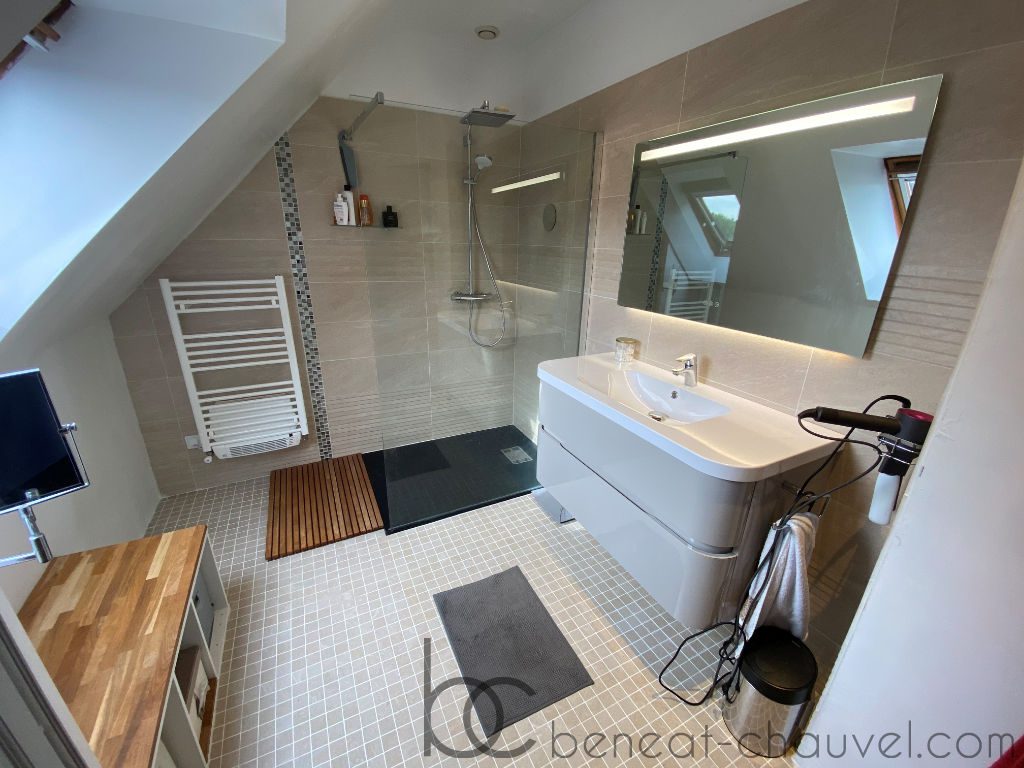 A l’étage se trouvent trois chambres, une salle d’eau et wc.