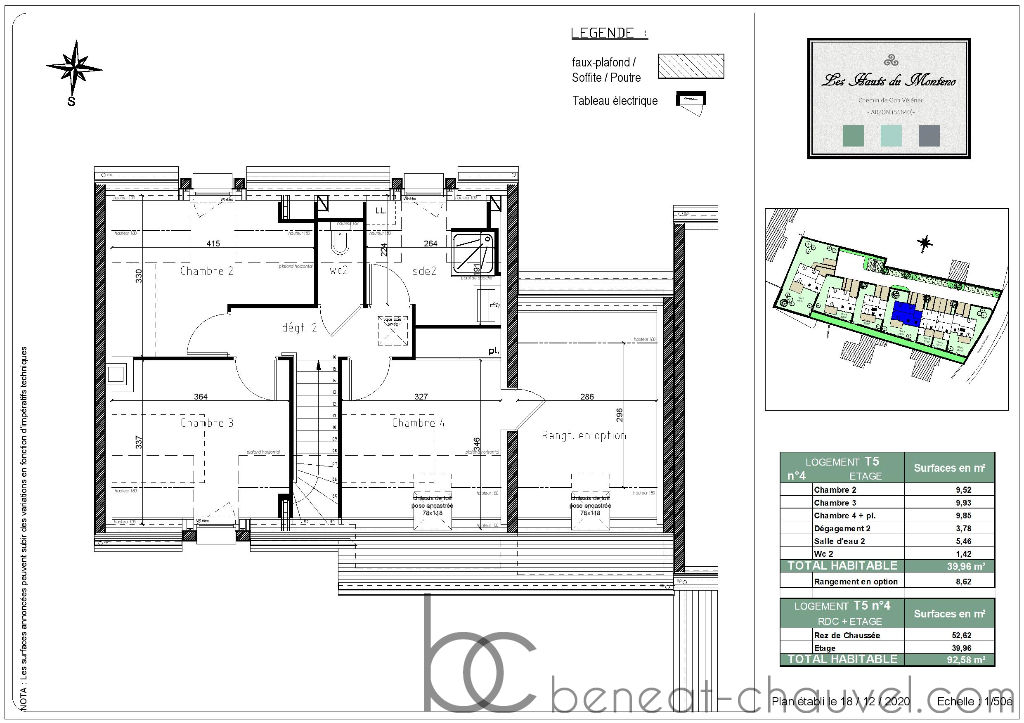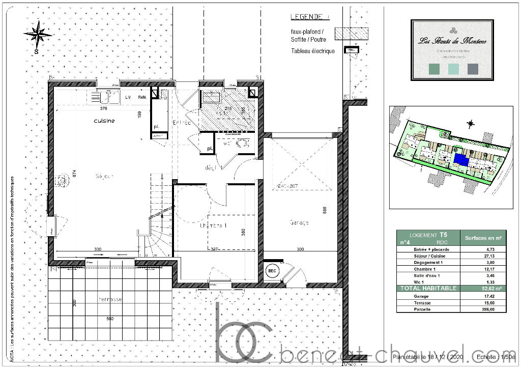 Au rez de chaussée, entrée avec placards, séjour cuisine donnant sur terrasse exposée SUD, dégagement, chambre, salle d’eau et W.C.
