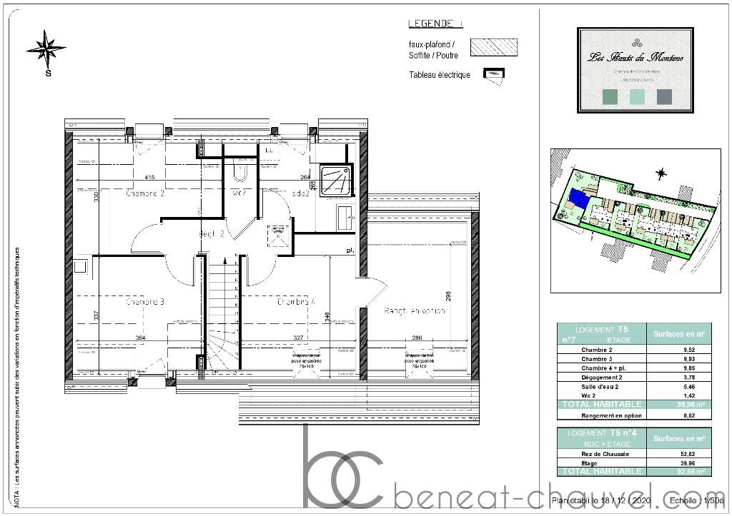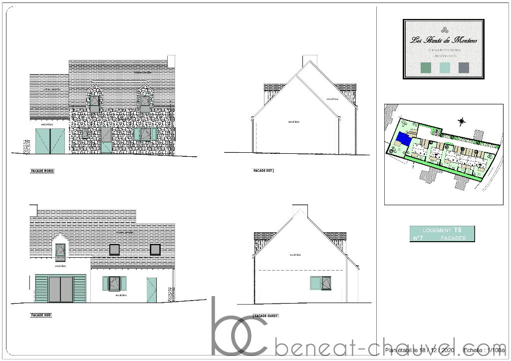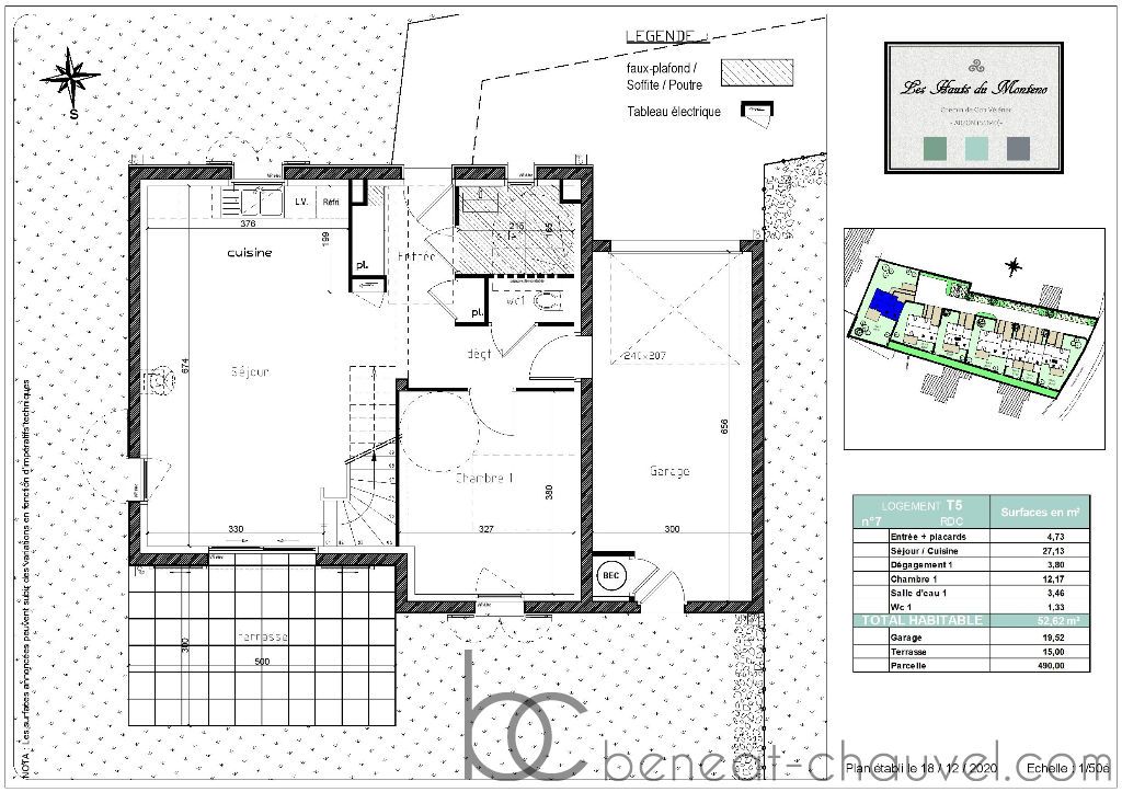 Au rez de chaussée, entrée avec placards, séjour cuisine donnant sur terrasse exposée SUD, dégagement, chambre, salle d’eau et W.C.