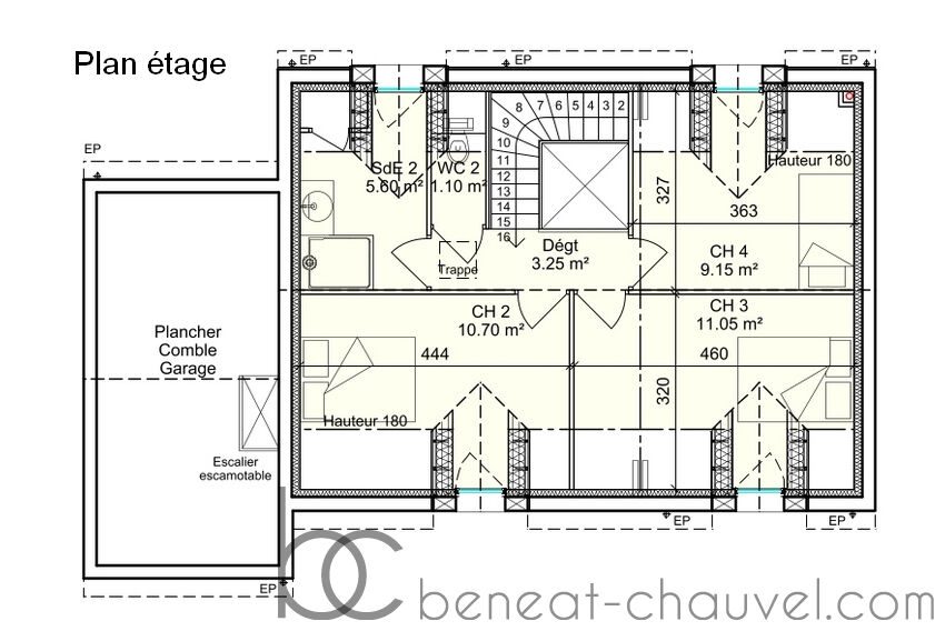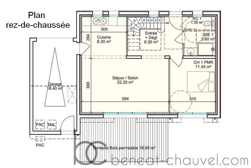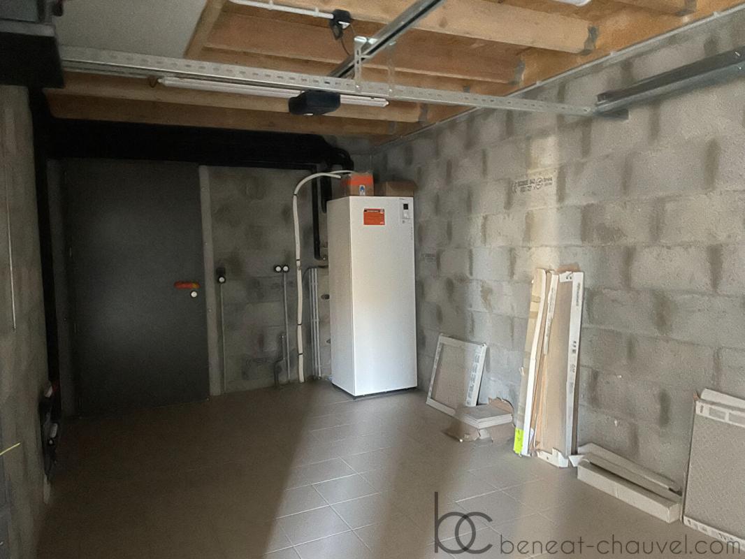 Garage avec grenier aménageable sur un terrain clos et engazonné de 302 m² avec jolie terrasse en bois.