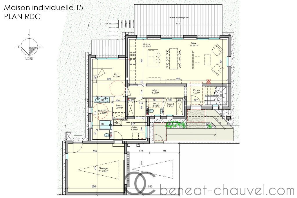 Maison neuve d’architecte RT2012 aux prestations de qualités à proximité du Golfe et du centre bourg de Sarzeau comprenant entrée avec WC vaste salon séjour, grande suite parentale au RDC. A l’étage, 3 chambres, salle de bains et WC.