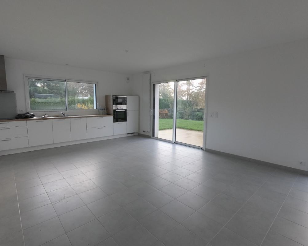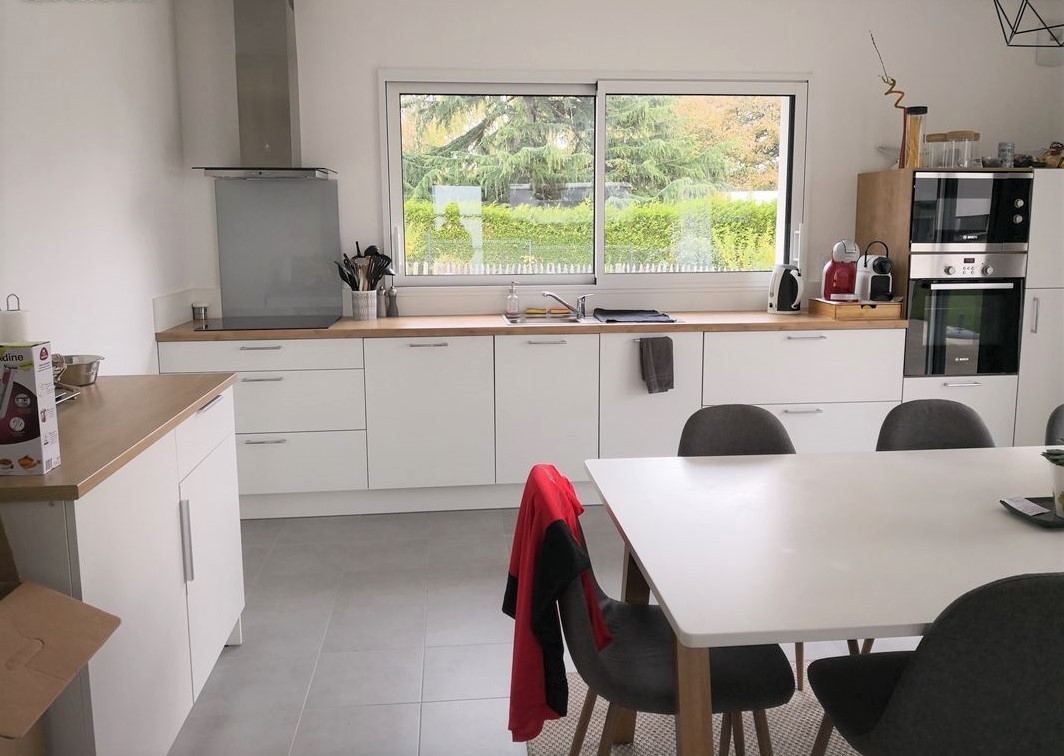 Maison contemporaine offrant une belle pièce de vie lumineuse, une cuisine ouverte aménagée et équipée (hotte, plaques, four, lave vaisselle, micro-ondes, réfrigérateur), une chambre avec dressing, salle d’eau. Cellier. Un garage