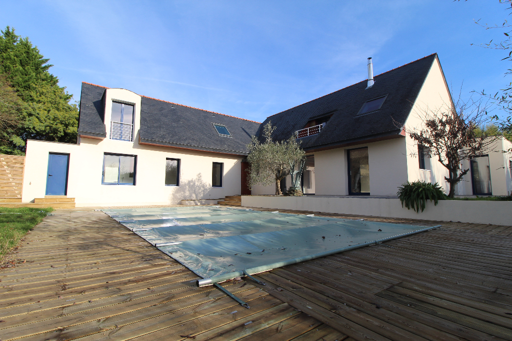 ARZON Le charme du Golfe pour cette Maison contemporaine avec piscine située dans un endroit calme et recherché en limite d’une zone naturelle protégée, comprenant vaste séjour salon exposé sud ouest, cuisine ouverte aménagée et équipée, cellier, 6 chambres dont 2 suites parentales, salle d’eau, WC, garage. Ses grands volumes et son terrain de 1220 m2 vous séduirons.