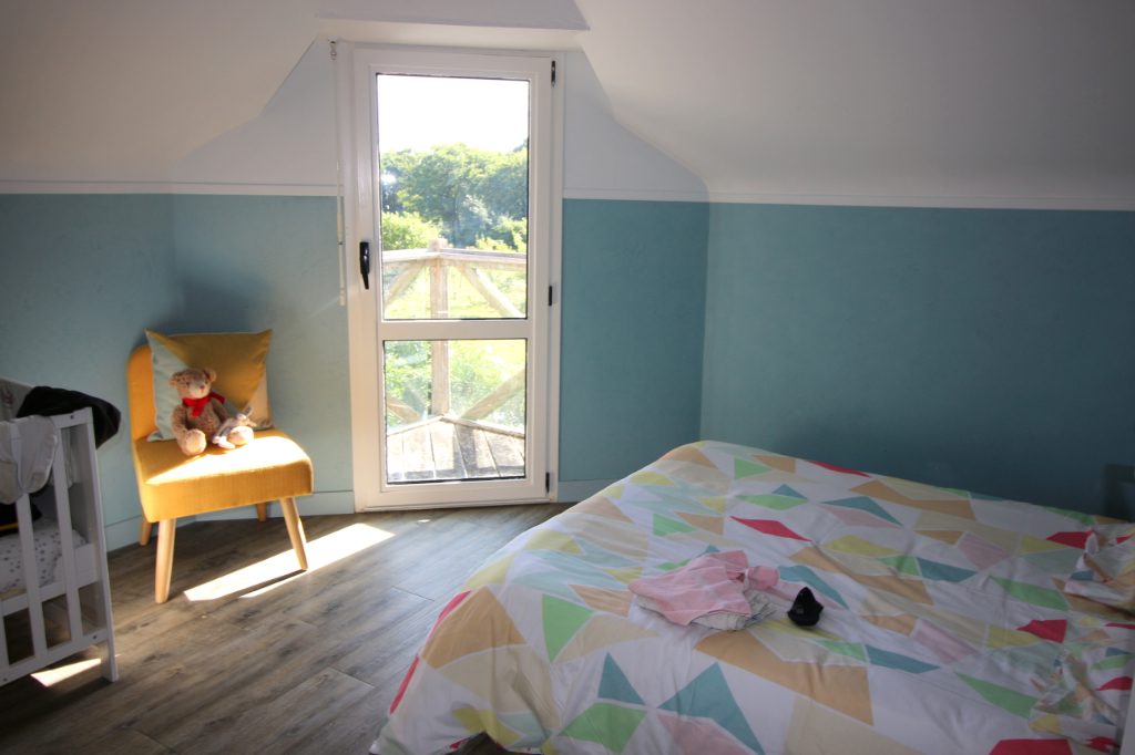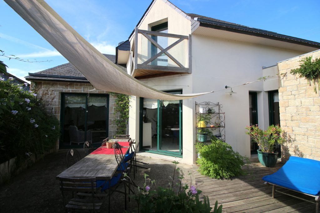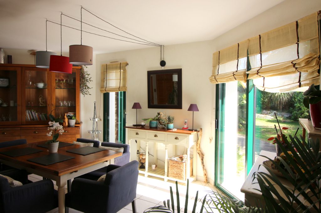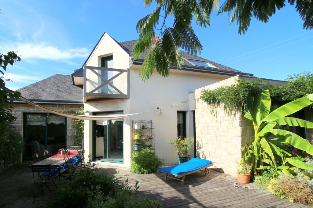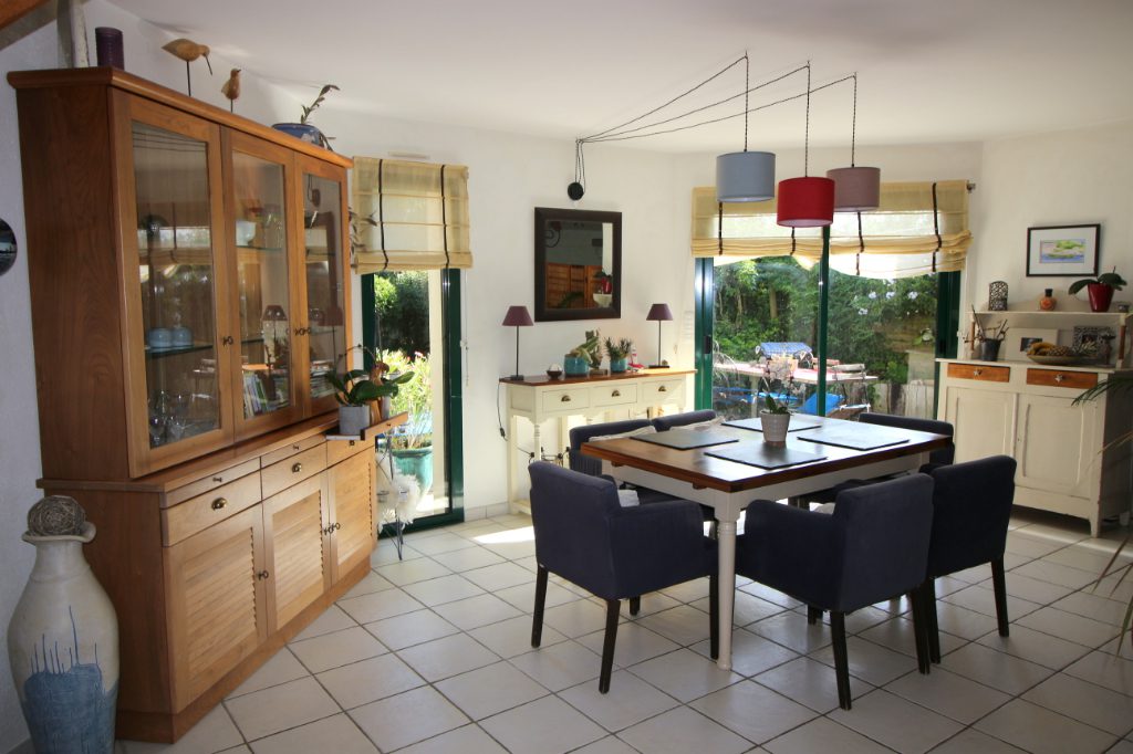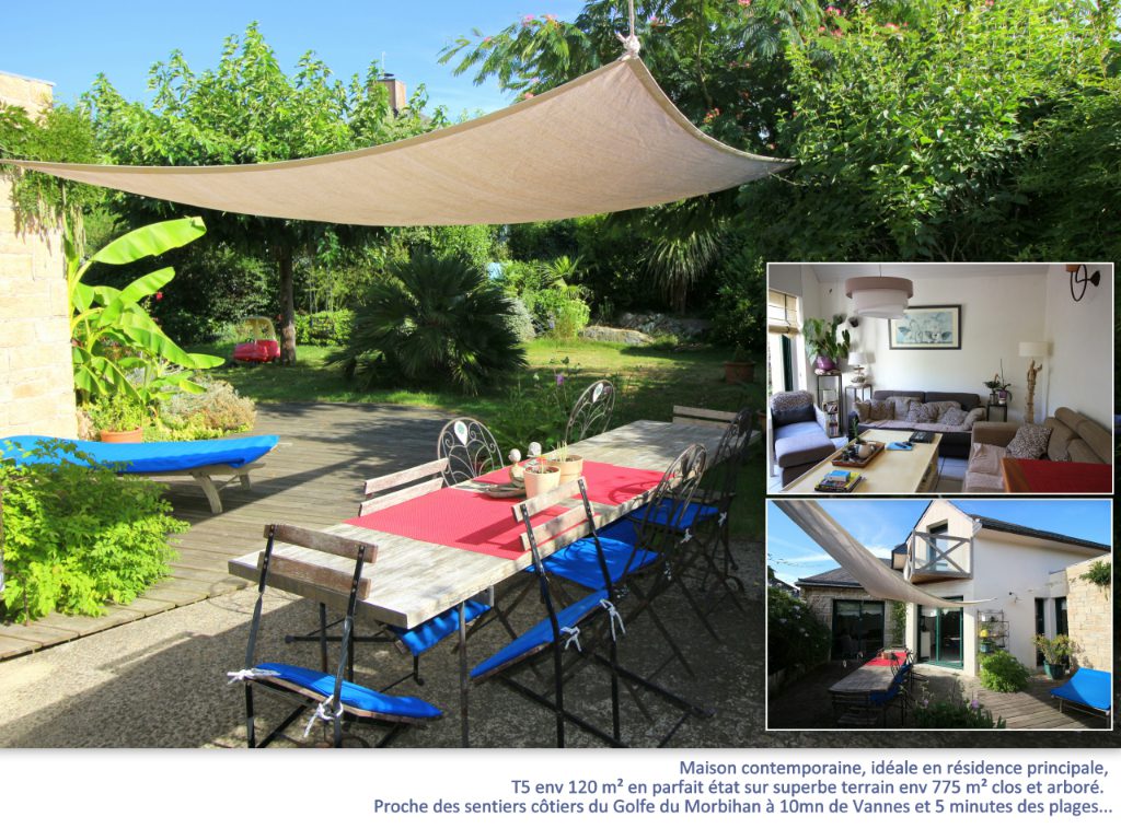 Maison contemporaine de 120m2 env. en parfait état, proche des sentiers côtiers du Golfe du Morbihan à 10mn de Vannes et 5 minutes des plages comprenant entrée avec placard, séjour, salle à manger, cuisine ouverte équipée, 1 Chambre avec dressing et SDB.WC