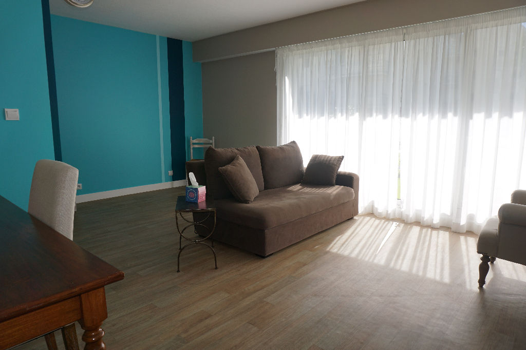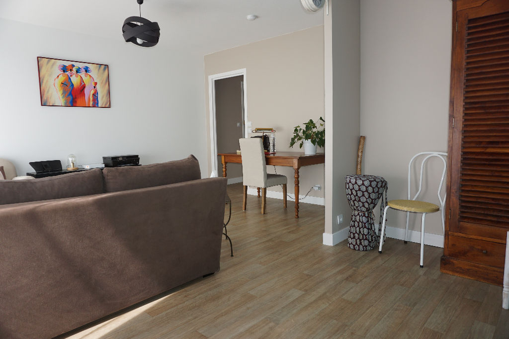 Hall, séjour donnant sur le balcon, coin chambre, cuisine équipée, cellier, salle de bains, wc.