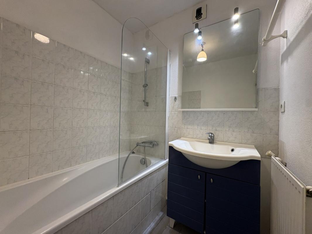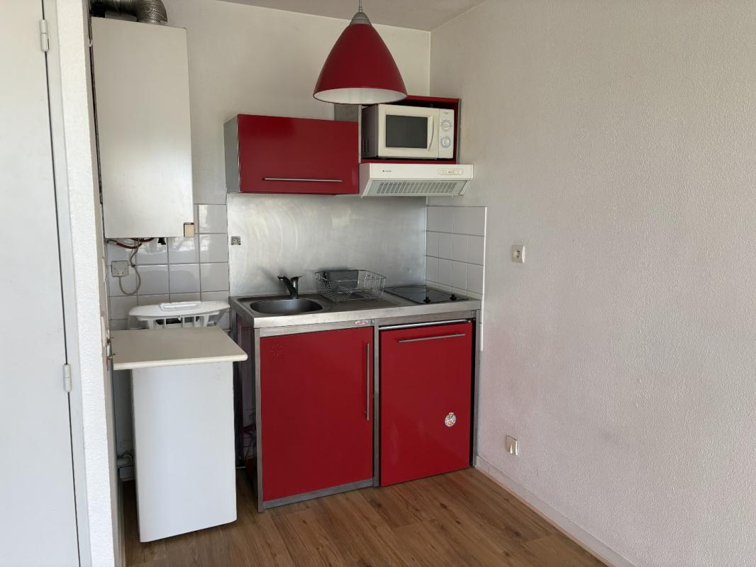 Appartement de type 2 comprenant une entrée avec placards de rangement, une cuisine équipée (plaque de cuisson, hotte, micro-ondes et machine à laver), un séjour lumineux ouvrant sur un balcon, une chambre avec rangements, une salle de bain ainsi qu’un WC séparé.