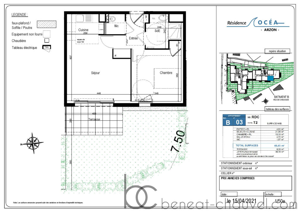 Emplacement et environnement de 1er choix à 200 m centre bourg et Port Crouesty pour cette résidence de 41 logements avec ascenseur, au rez de chaussée, bel appartement de type 2 comprenant entrée avec placard, séjour, coin cuisine, chambre avec placard, salle d’eau et WC indépendant.