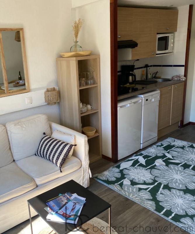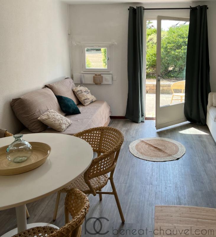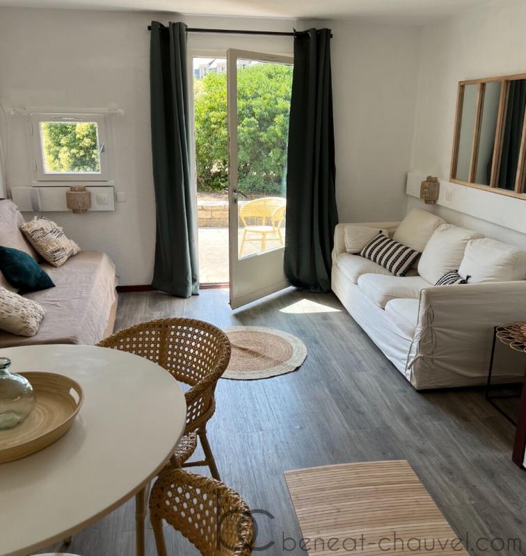 EXCLUSIVITE – Dans une résidence en accès direct à la plage du Fogeo, un appartement rénové situé au rez-de-chaussée et exposé plein ouest. Il comprend : entrée, pièce de vie avec coin kitchenette aménagé et équipé, chambre, salle de bains, W.C. Casier-plage. Possibilité parking en sous-sol en sus.