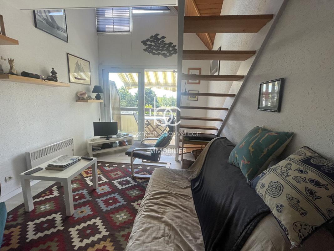 EXCLUSIVITÉ appartement duplex comprenant : entrée, salon avec coin cuisine rénové, terrasse avec store banne, chambre, mezzanine avec couchage, salle d’eau et WC. Un parking privatif vient compléter ce bien.