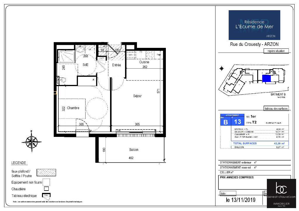Arzon, emplacement et environnement de 1er choix à 300 m centre bourg et Port Crouesty. Dans une résidence exposée sud, à taille humaine avec ascenseur, de 24 logements, au 1er étage bel appartement de type 2 comprenant, entrée avec placard, séjour, coin cuisine, chambre avec placard, salle d’eau avec WC.