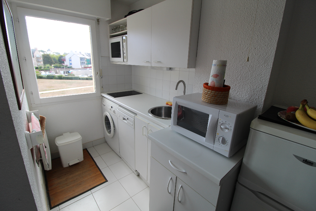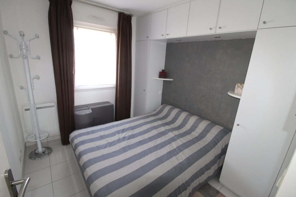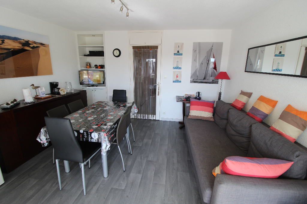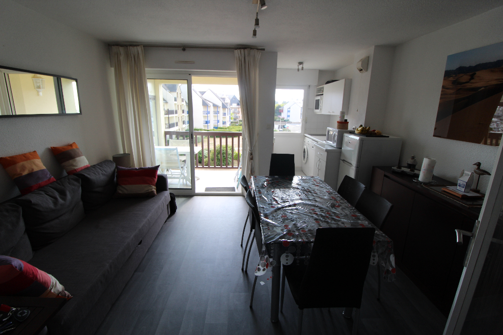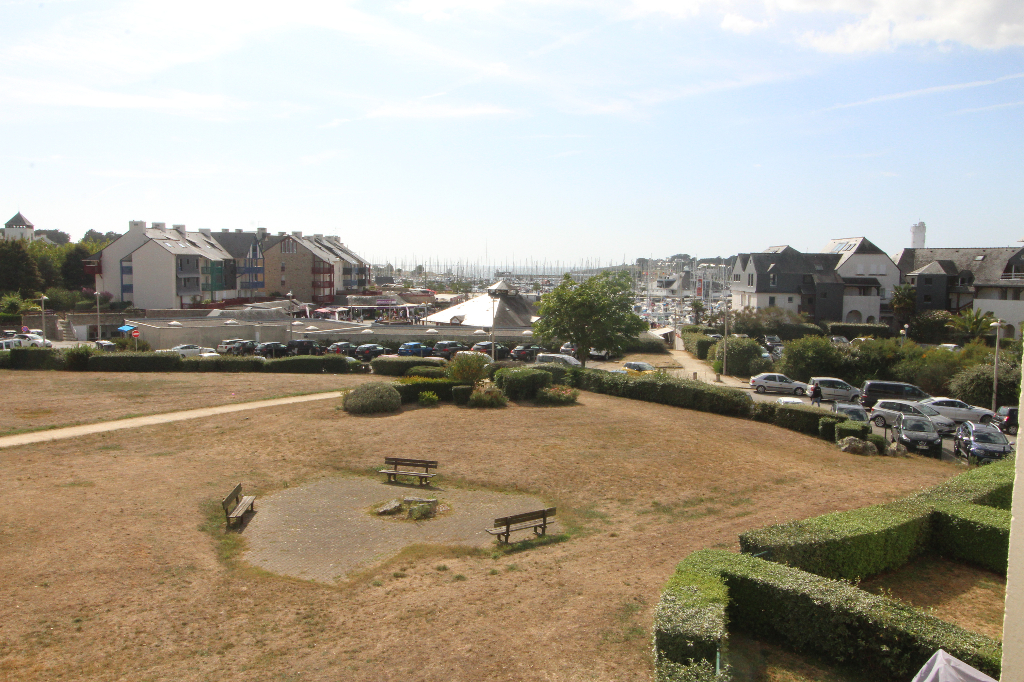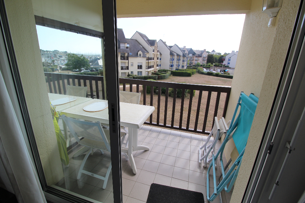 Vue Port du Crouesty, exposition sud ouest, bel appartement 2 pièces comprenant : Entrée, séjour avec coin cuisine aménagé et équipé, chambre, salle d’eau, wc. Parking privatif,